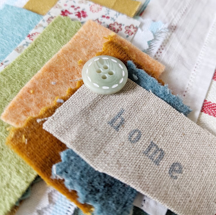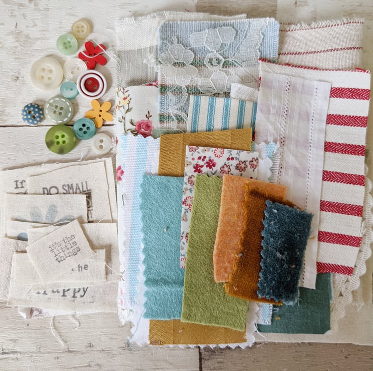 A collection of mixed fabric pieces with trims, buttons and hand stamped snippets and words.