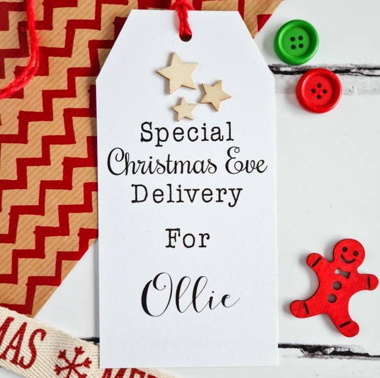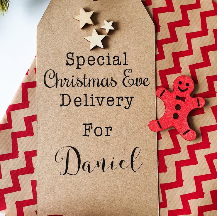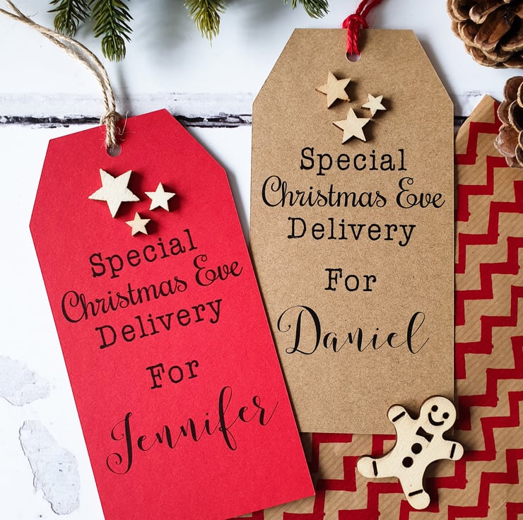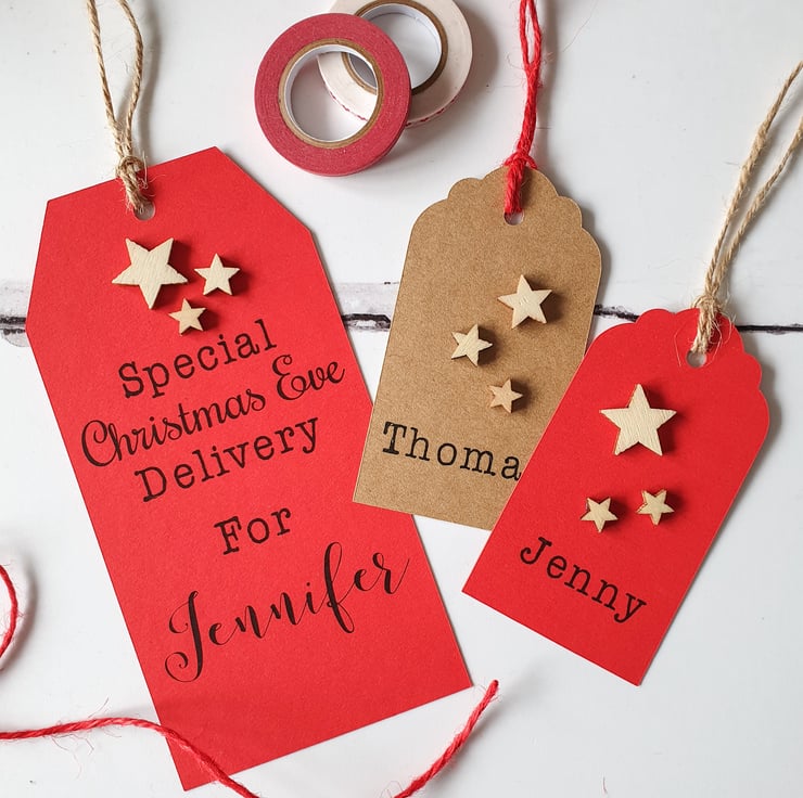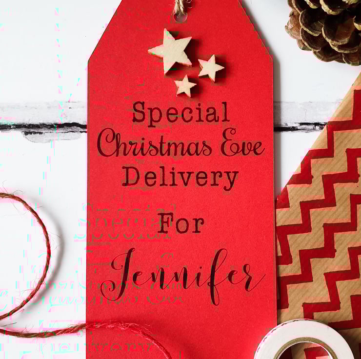 These festive large Christmas Gift Tags are designed to be used on a Christmas Eve Box. Each tag measures 8 x 16cm and is fully personalised to your child, children or family. Choose from festive Red or traditional Kraft; each gift tag is completed with a length of contrasting Christmas twine and Birch wood stars.