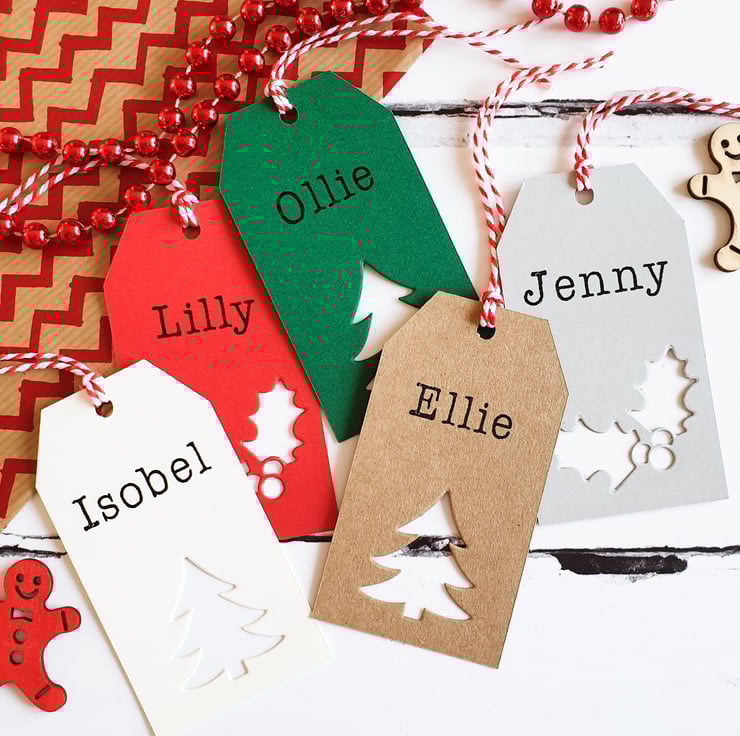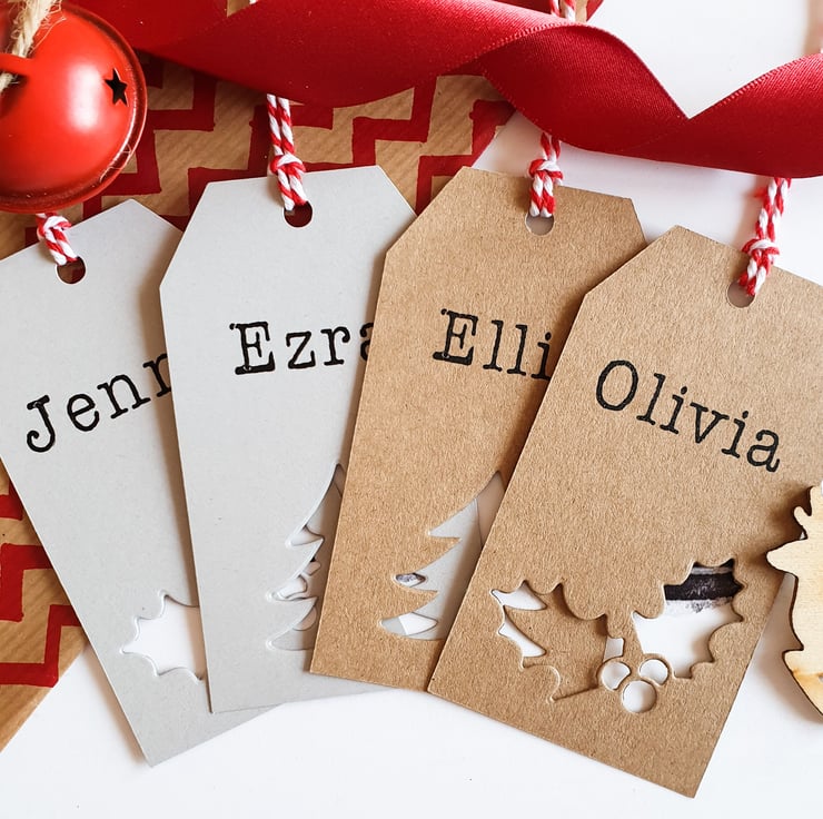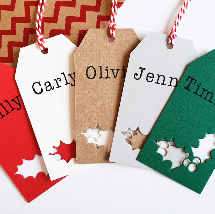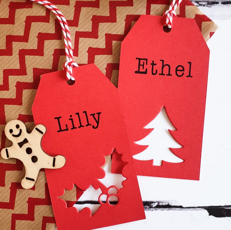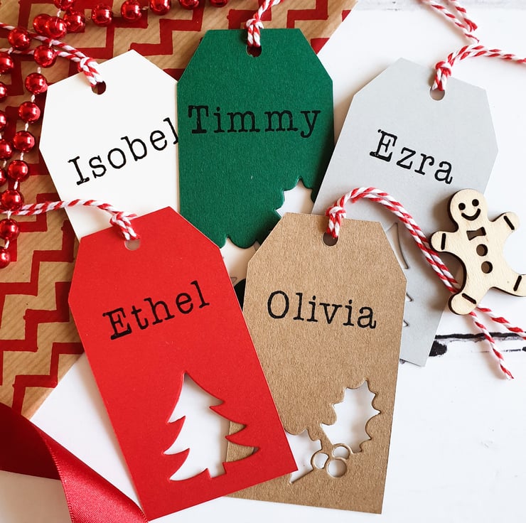 Festive Christmas gift tags in a traditional style, these lovely custom gift tags are personalised with any name. All of our Christmas tags are handmade, in a range of heritage inspired festive colours. These merry gift tags are finished with a Holly or Tree shape and candy cane twine. The perfect, personal touch to your Christmas gift wrap.