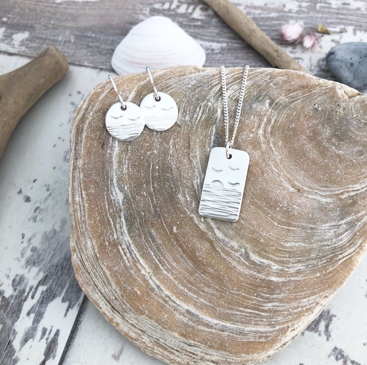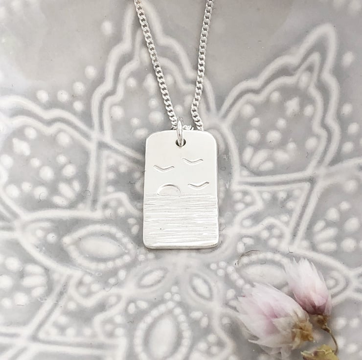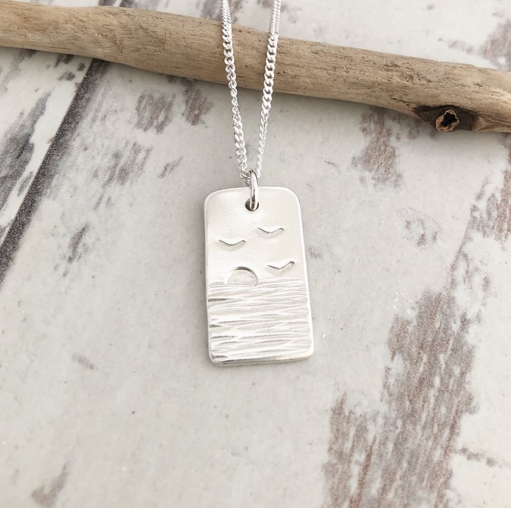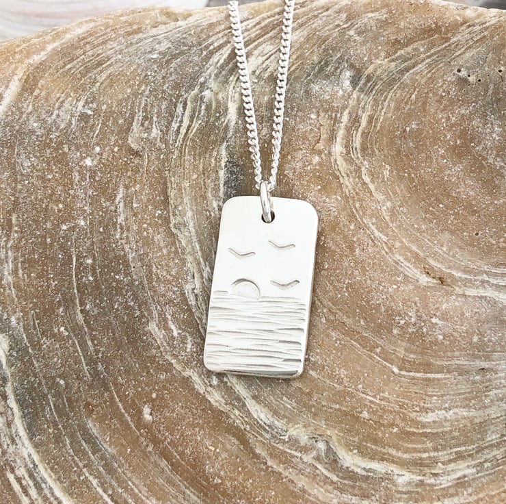 This fabulous pendant is hand cut from sterling silver sheet then I texture the silver to create the sea, the birds and setting sun is then hand stamped. Your pendant is then smoothed and polished.