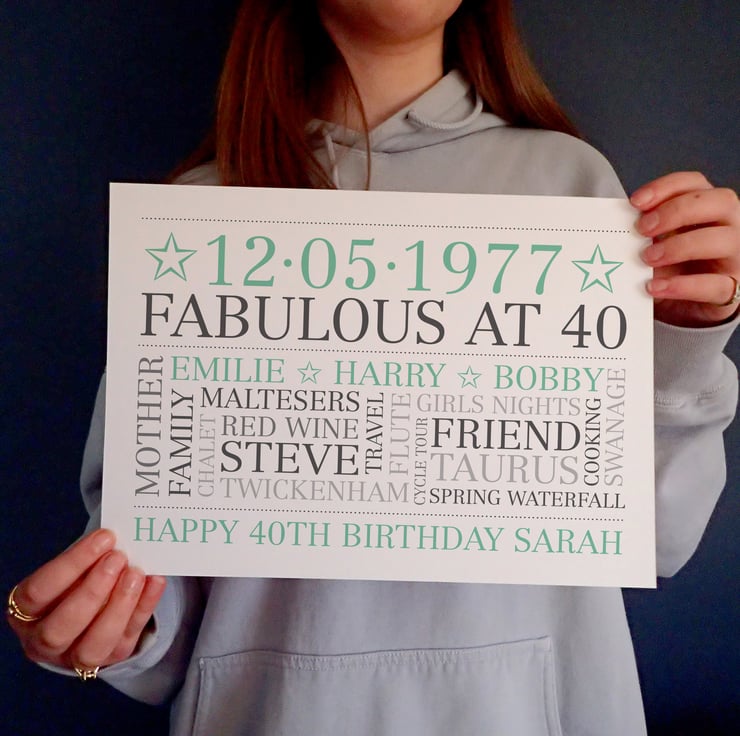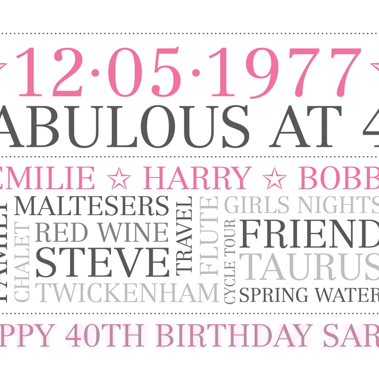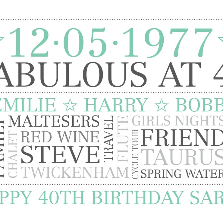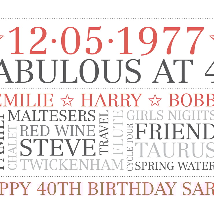 - About 30 personal words (If there are certain words that are particularly important please add a star next to them in your list and I will make these words the biggest and most noticeable.)