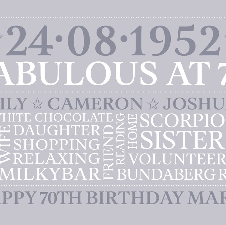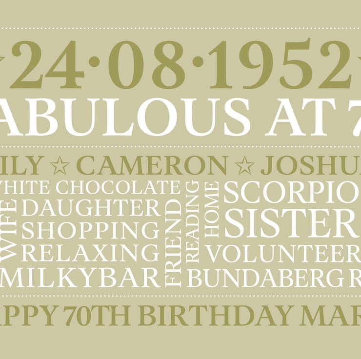 - About 30 personal words (If there are certain words that are particularly important please add a star next to them in your list and I will make these words the biggest and most noticeable.)