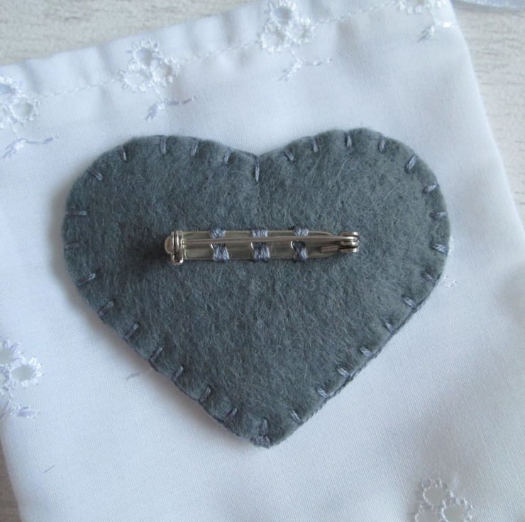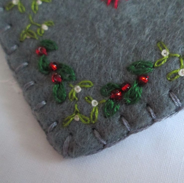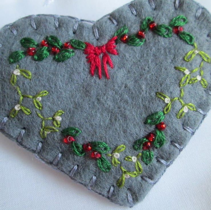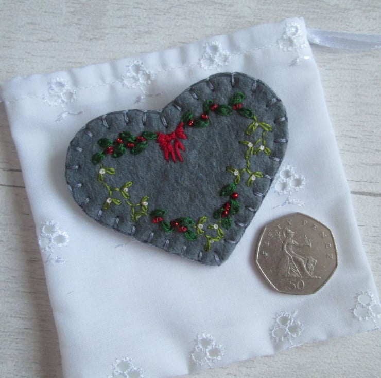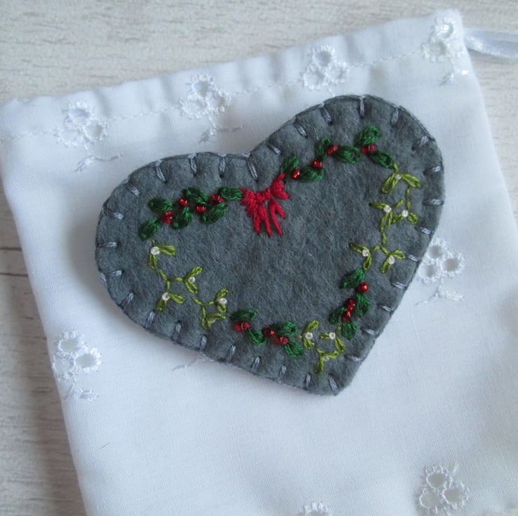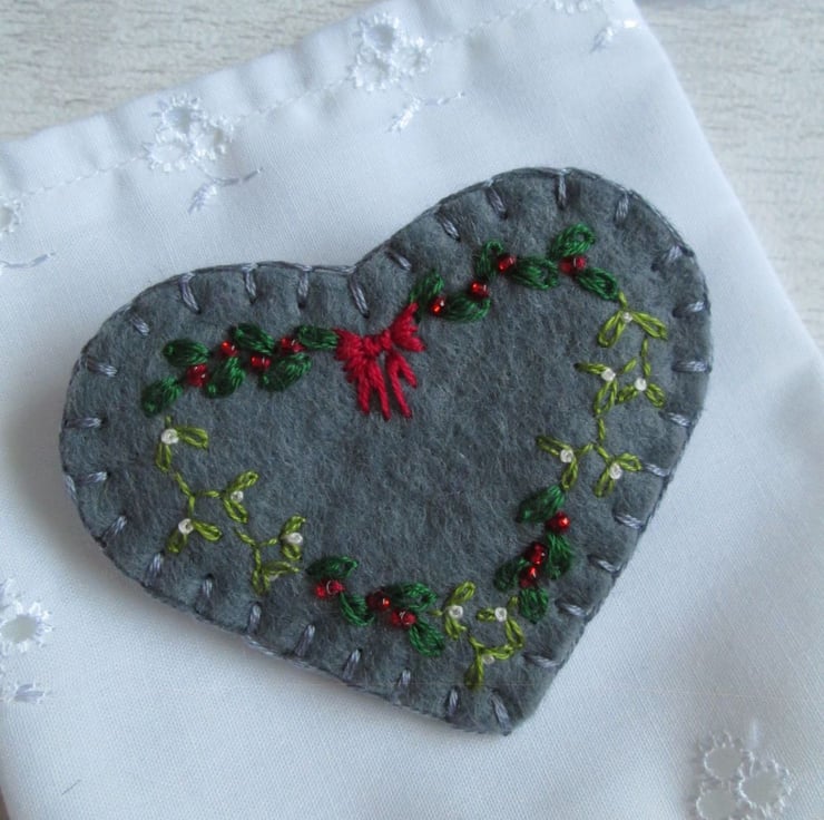 A lovely brooch for winter featuring a hand embroidered garland of holly and mistletoe worked on a grey wool felt heart and embellished with tiny glass beads. Edged with grey blanket stitch and fitted with a metal brooch clasp, this handcrafted brooch would look great on anything from a denim jacket to a winter coat.