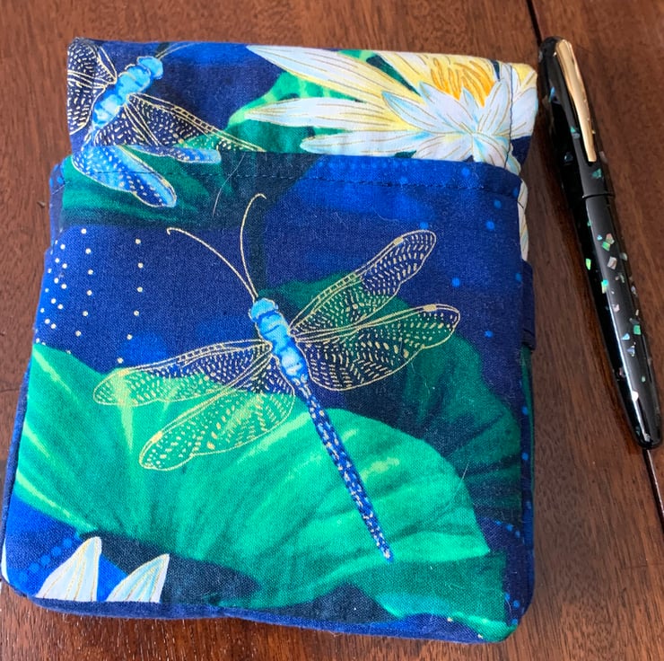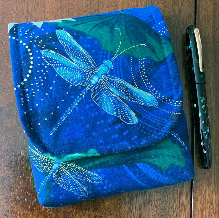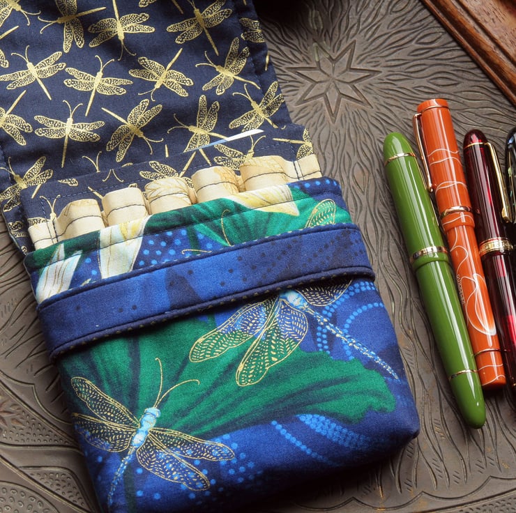 The outer, padded case contains a removable stiffened insert with fabric loops to hold, separate and protect the pens. All visible fabrics are 100% cotton. Three types of interlining provide cushioning, support and stability. The pen slots are 10 cm long so give excellent protection and will house all but the chunkiest of pens, while the tuck-under outer flap adjusts to accommodate extra-long pens. There is space behind the insert in which to tuck a note of pens and inks, plus a small slim notebook. Only a very limited number of each case will be made.