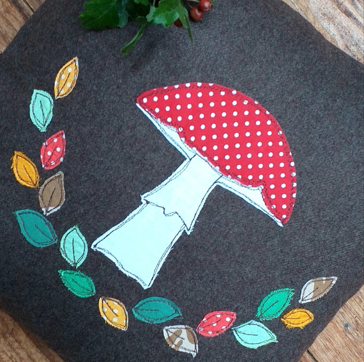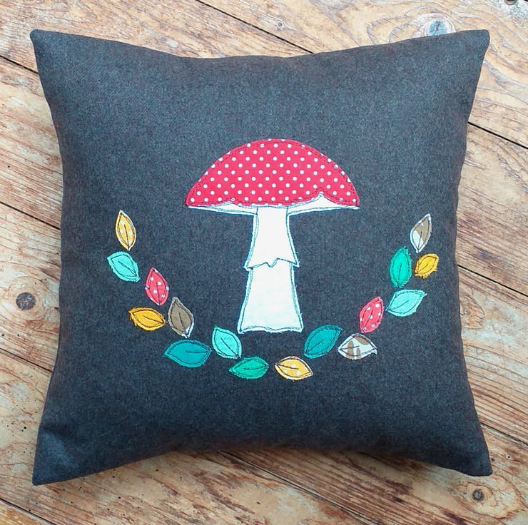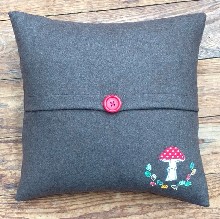 A soft, cosy wool cushion, with an appliqued toadstool and autumnal leaves. As the nights start drawing in, make your home all cosy with a beautiful wool cushion, depicting a spotty red toadstool and leaves in soft, autumnal shades. Using fabric scraps, the design is cut freehand and then appliqued onto the chocolate brown wool using free motion embroidery. The wool fabric is then made up into an envelope-style cushion cover. On the back, the design is repeated in miniature, and the cushion fastens with a bright red wooden button.
