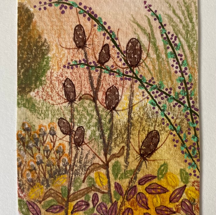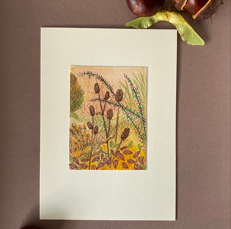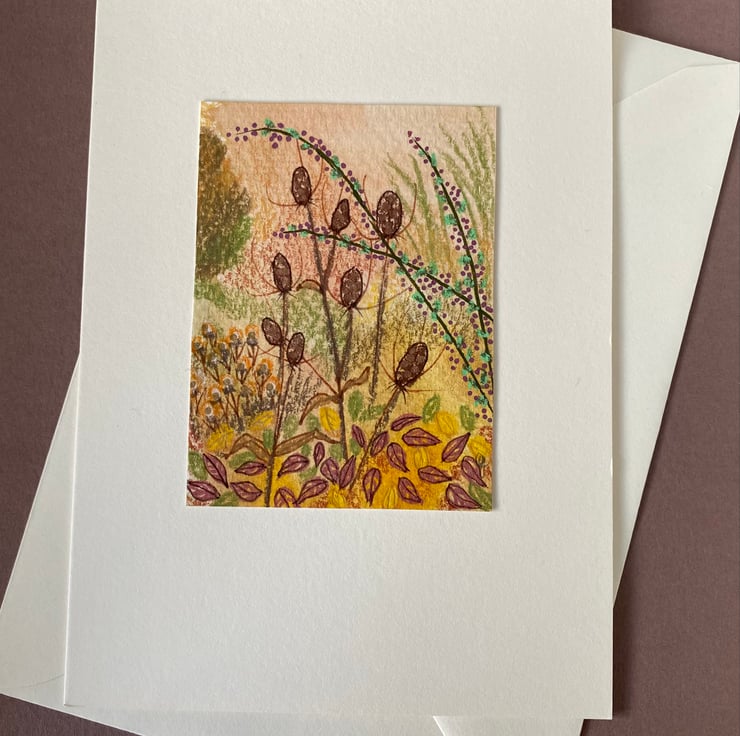 This mini mixed media artwork has been hand painted on watercolour paper, then mounted on cream colour card. The card measures 14.8cm x10.5cm (6” x 4”approx) and comes with a matching envelope in a cello bag. It is blank inside for your own message. Postage is free to UK destinations.