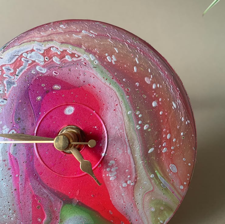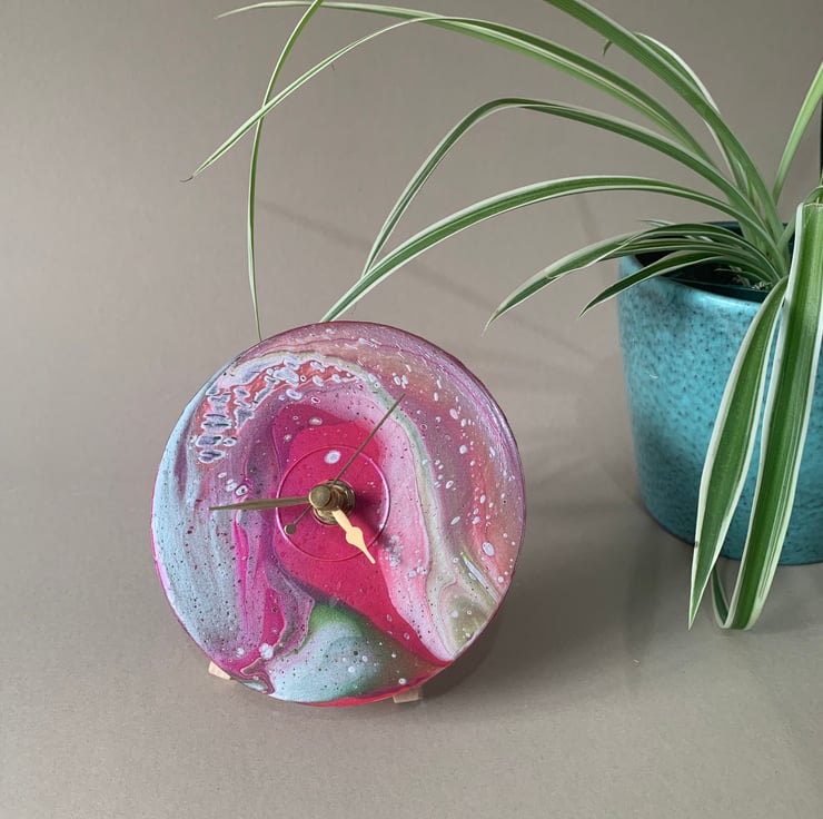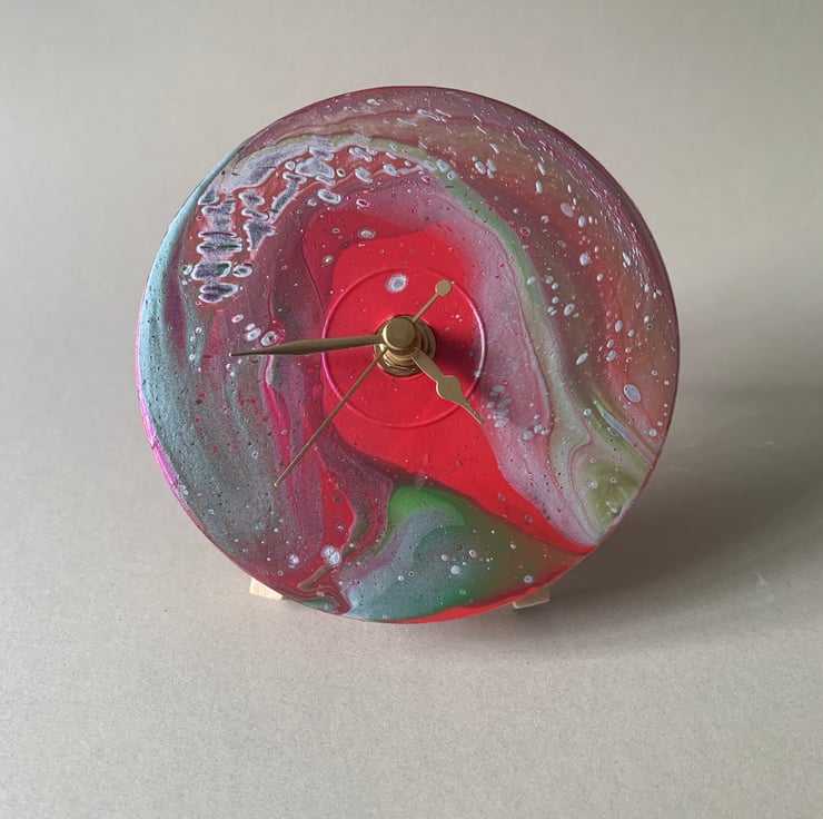 Upcycled from a CD this little clock is 4.75”/12cm in diameter. It has been painted with acrylics using the ‘pour’ method and varnished to seal. The back is felted for a clean look and it is fitted with a quartz mechanism(silent sweep) and gold coloured hands. It is small enough for a bedside table, shelf, bookcase or display cabinet, and includes a wooden easel-type stand. It can also be hung on a wall if desired.