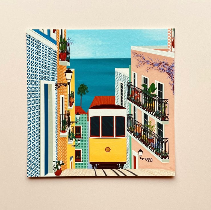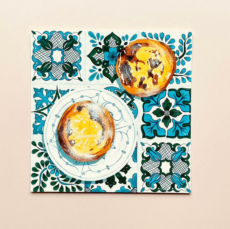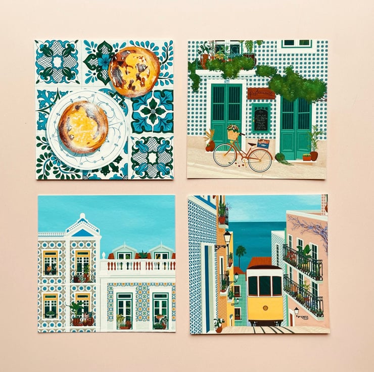 A set of Portuguese inspired scenes from Lisbon featuring its yellow tram, pasteis de nata (pastel de nata or custard tarts), and tiled houses. Perfect to keep as mini prints or a gift for travelers.