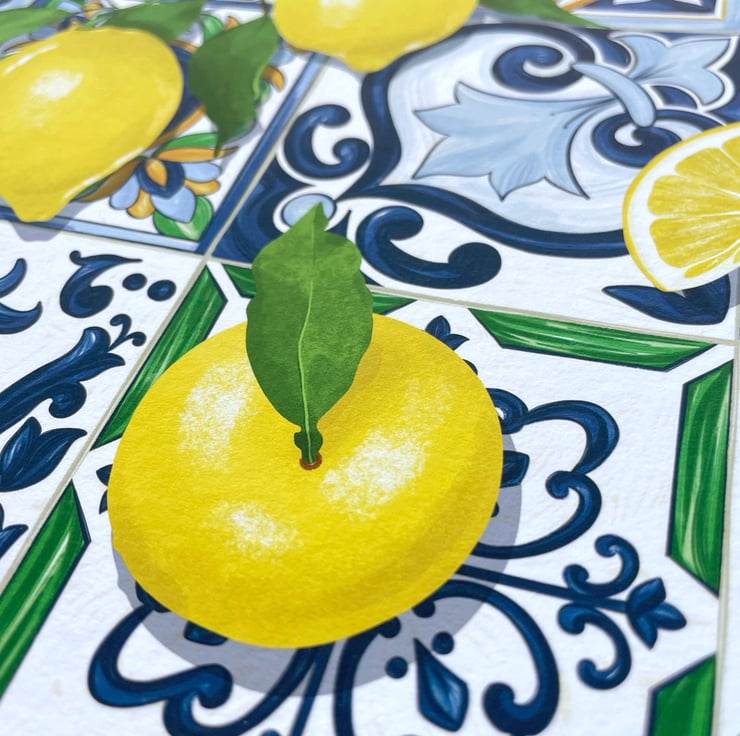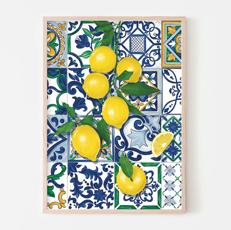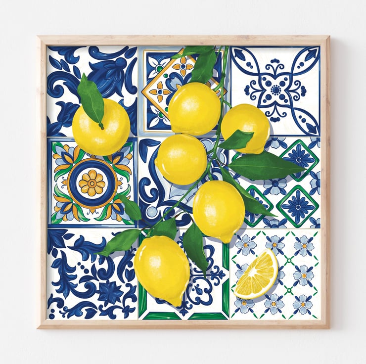 Bright yellow Sicilian lemons over beautiful Italian tiles. This juicy fruit art print will bring colour and fun into any kitchen. The perfect wall art for a foodie or Italy enthusiast.