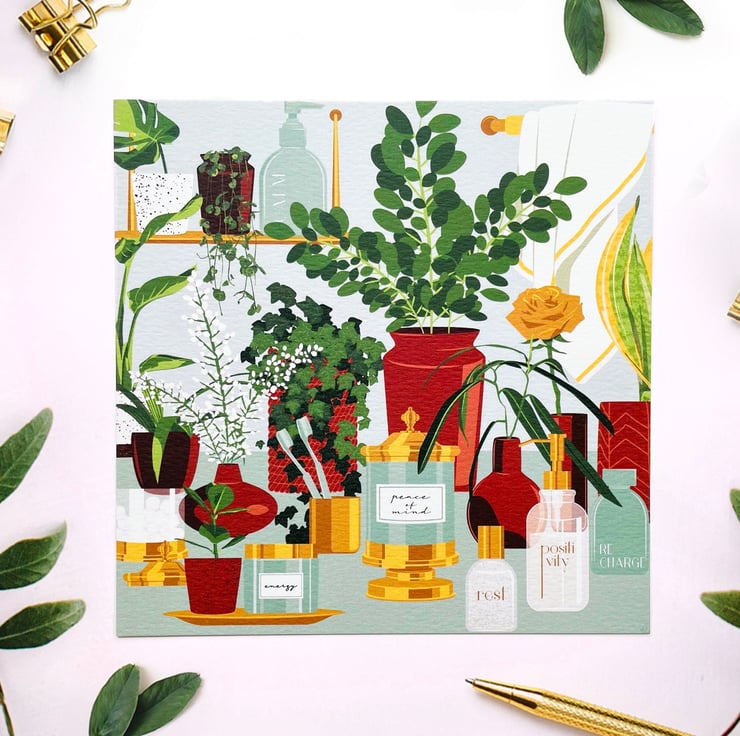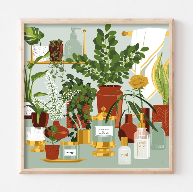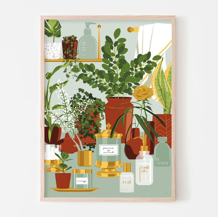 Wouldn't it be great if you could spray on peace of mind? Or quickly lather on some energy? If only these things could be bottled for later use! An art print to help remember to to set aside time to take care of your body and mind.