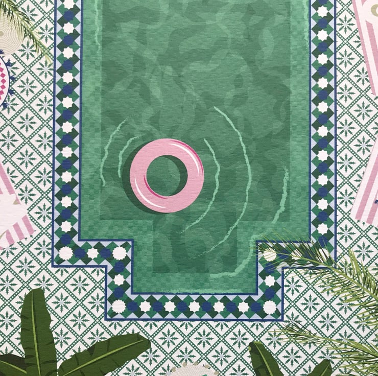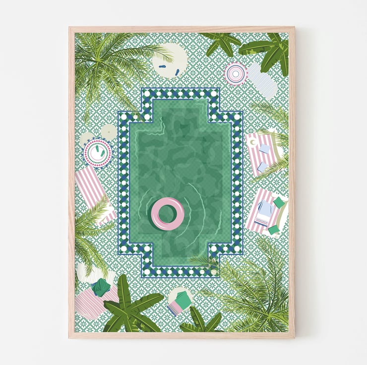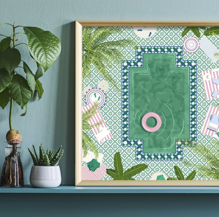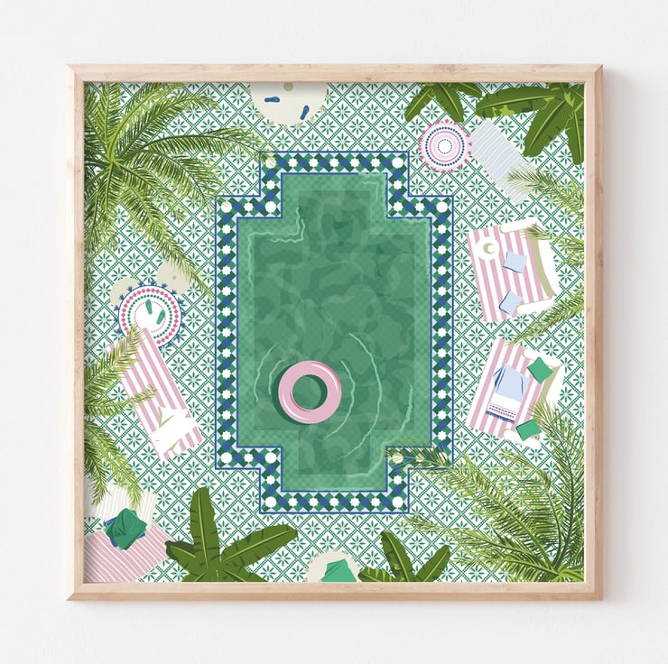 An illustration print of a beautifully tiled pool in a Marrakesh riad in Morocco. Comfortable lounging, cozy rugs and sweeping palm trees surround it creating a private and relaxing space.
