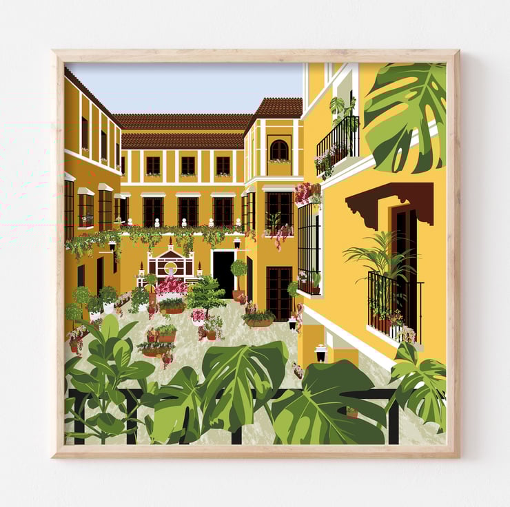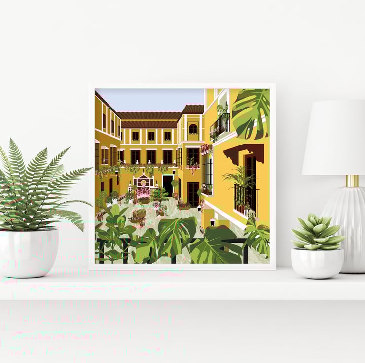 An illustration print of a view from a Spanish balcony overlooking a courtyard filled with plants and flowers in the sunshine. Perfect for your travel and plant enthusiast loved ones.