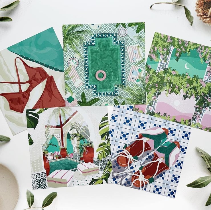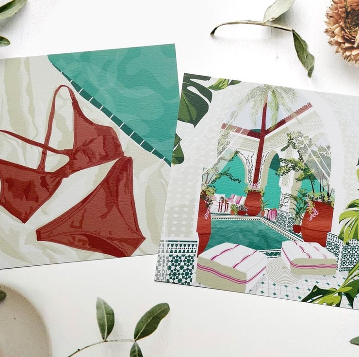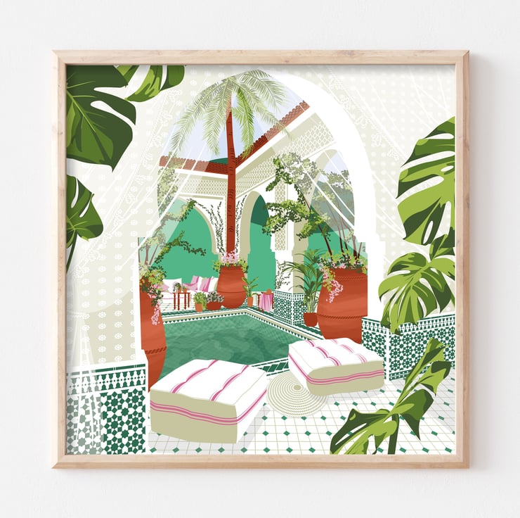 An illustration print of a beautifully tiled Moroccan riad. Comfortable lounging, cozy rugs and sweeping palm trees surround it creating a relaxing space.