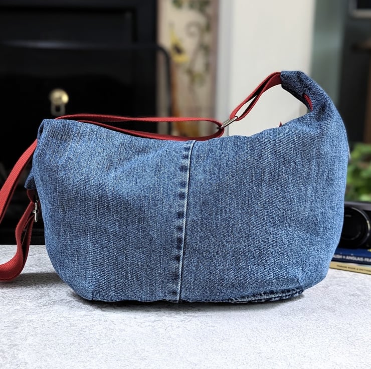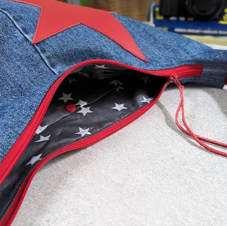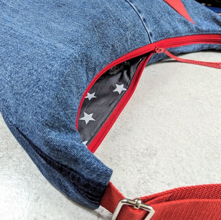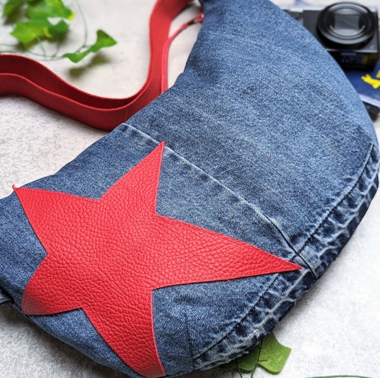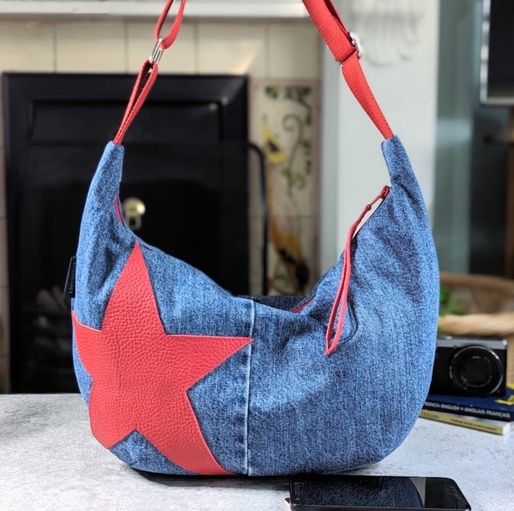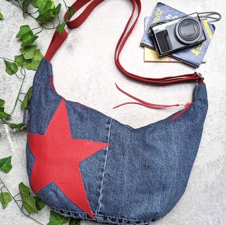 Upcycled denim jeans with an appliqued red leather star gives this cross body dumpling bag a contemporary feel with a bold pop of colour.