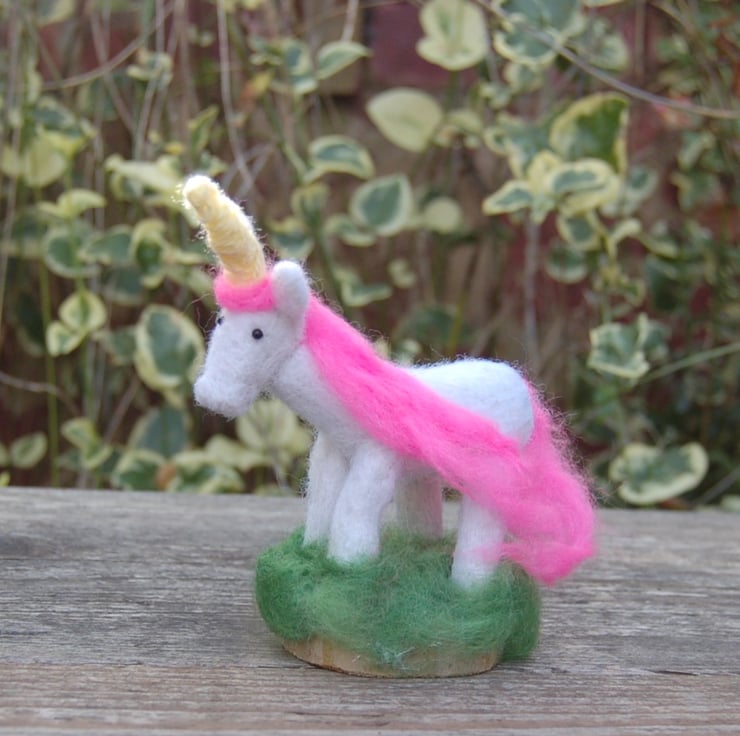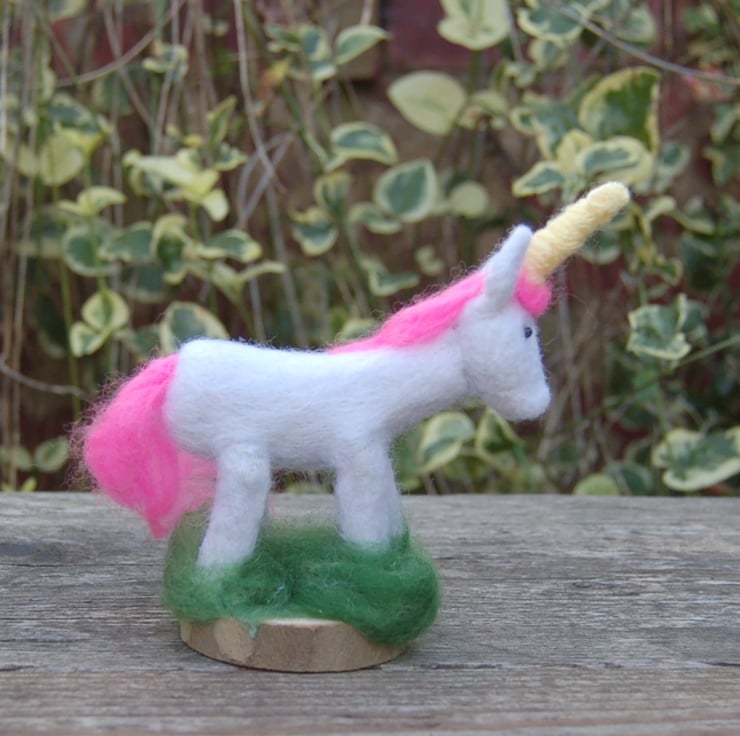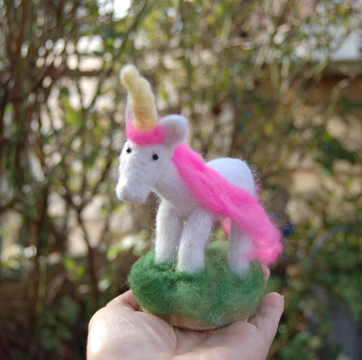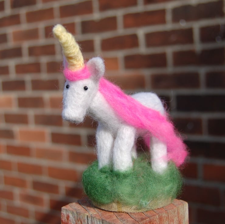 Made from needle felted soft white sheep wool and fluffy pink merino wool fibres. Aubrianna's yellow horn is a length of wool yarn wrapped tightly into shape.