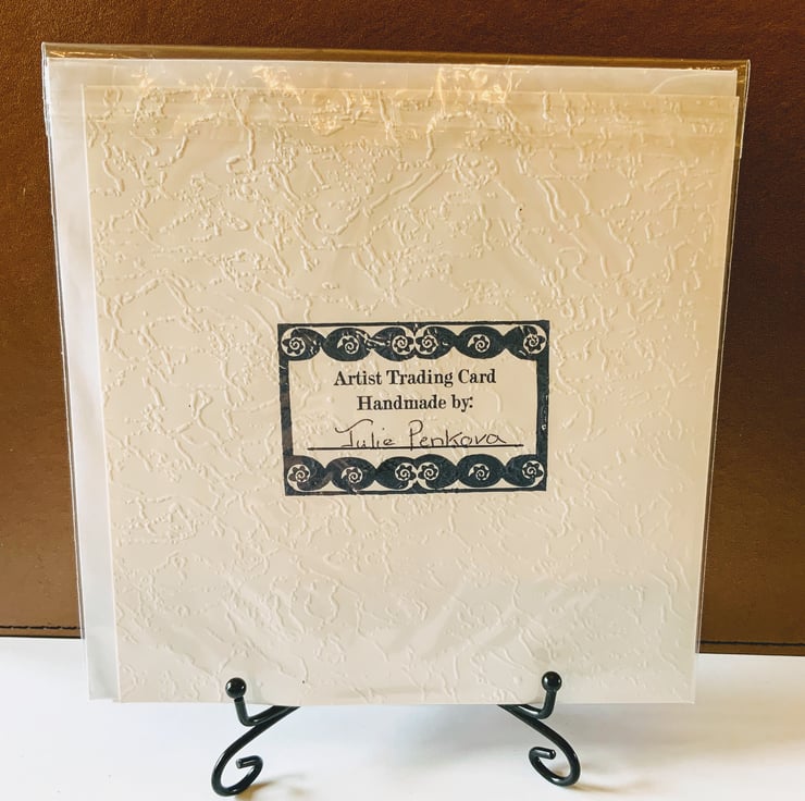 Mounted on a A5 square card and framed with gold and green lace ribbon.