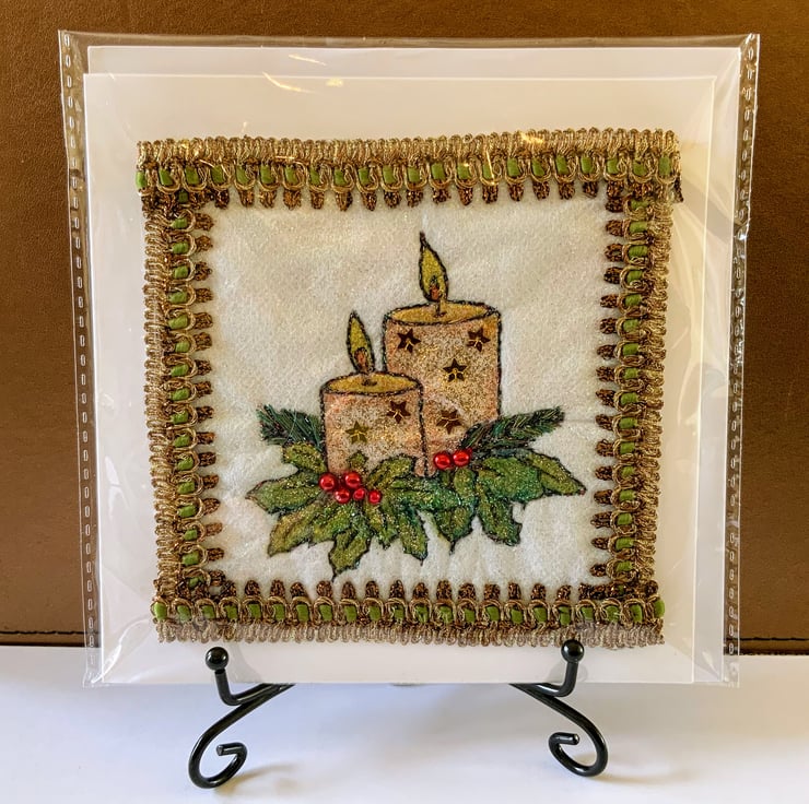This is a handmade textile card with hand painted and embroidered candles within festive holly and berries embellished with stars and little red beads.