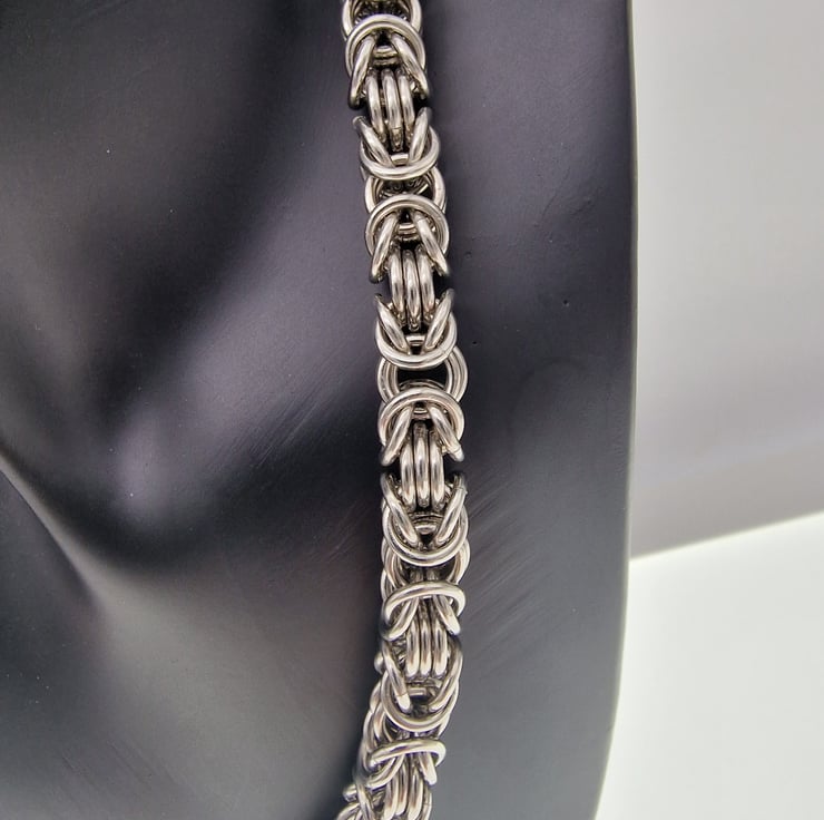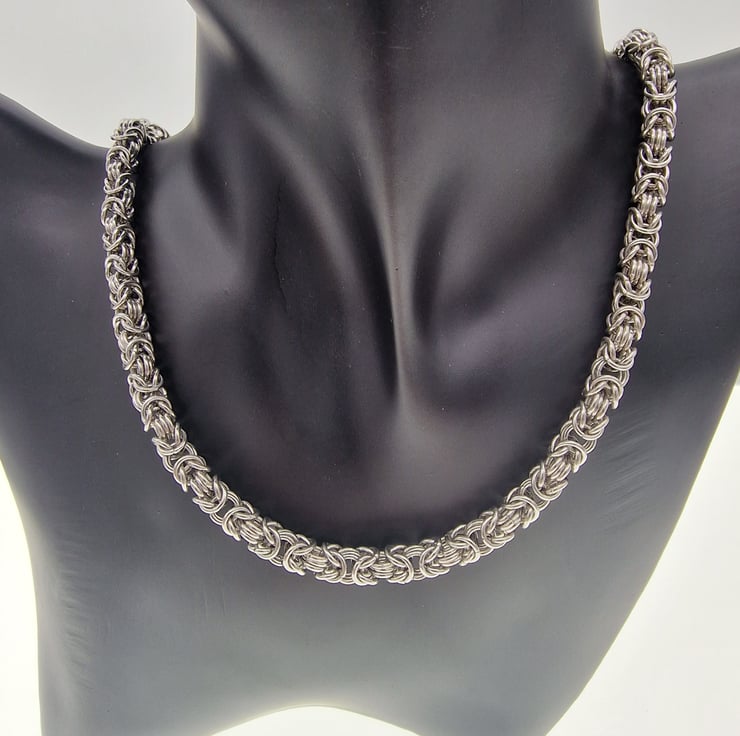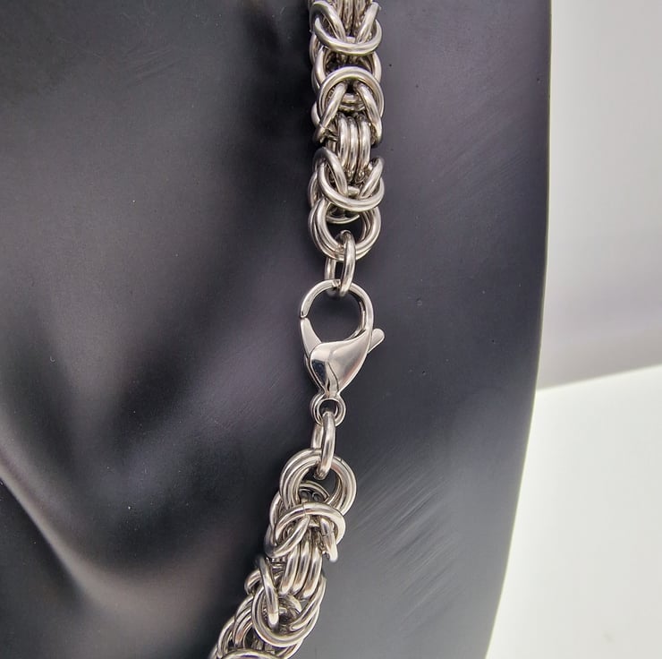 This exquisite Byzantine Necklace, crafted with care, offers two sizes: 18" or 20" long. It's made of 6mm stainless steel rings, plus a 1" extender chain, all securely held in place with a lobster clasp for daily wear. Lightweight and reliable, it's designed for long-lasting comfort.