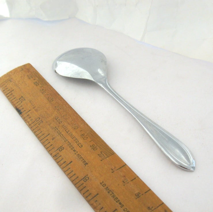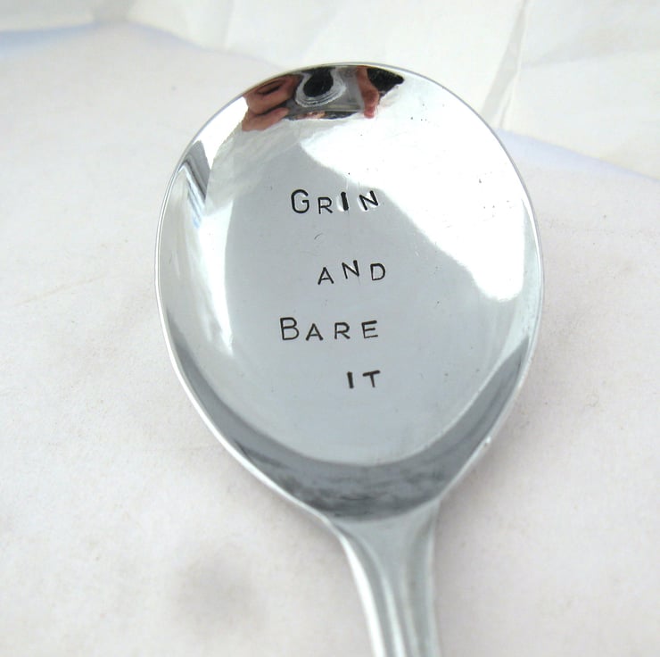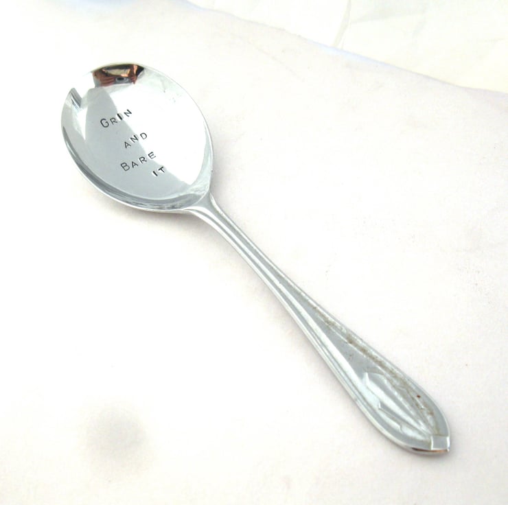 A cheeky little spoon hand stamped with GRIN AND BARE IT - the perfect gift for a naturist! It's a vintage chrome-plated fruit spoon with an art deco style handle and a wide shallow bowl and it measures approx. 14cm long. The lettering is coloured with a non-toxic water-based ink. You will receive the spoon shown in the photos; please note it's vintage (likely 1930s) so it's not completely pristine and perfect, there are some wear marks on the back and a bit of discoloration on the handle. It will all the same give many years' service (and smiles) as a soup, cereal or general-purpose camping spoon.