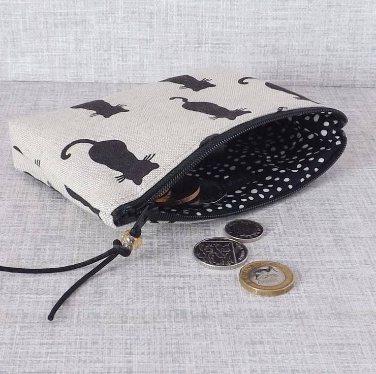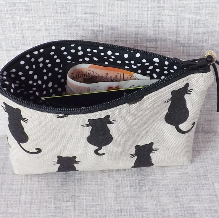 A medium size coin purse made from cotton canvas fabric with black cats on a beige background. The lining is a black cotton fabric with white spots on. There is a pocket on the inside for a credit/debit/store card or some notes.