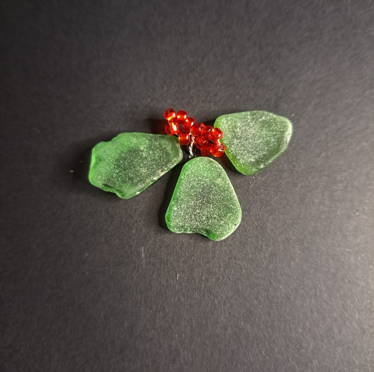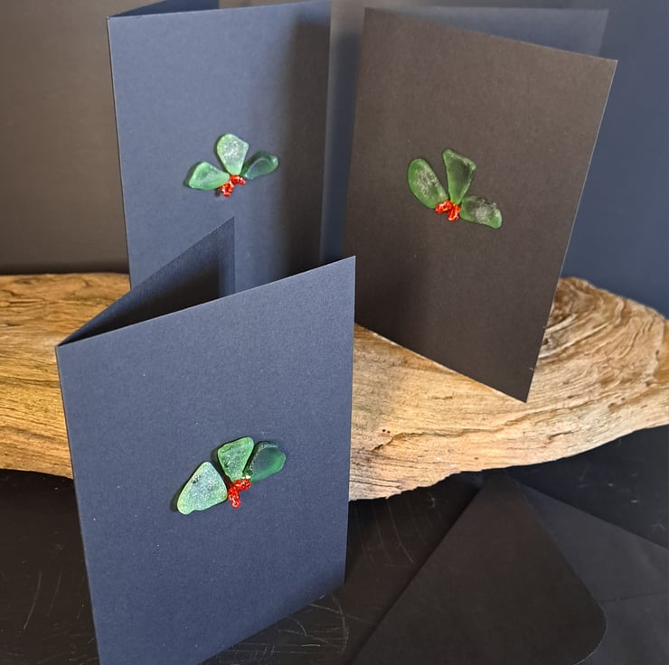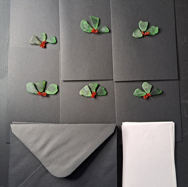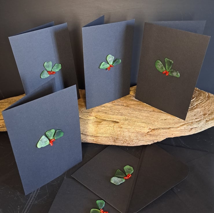 Set of six handmade Christmas card using lovingly sourced sea glass from the Kent coast. All of our sea glass is natural, we do not use tumbled or bought glass. Vintage glass beads have been used to create the baubles. These cute holly cards would adorn any Christmas mantle. These can also be reused and placed in a shadow box or frame for use every year. The card is left blank for your own festive message, a metallic pen works great. There is also a white self adhesive insert should you wish to use pen to write your message. Each card has a self coloured envelope and all card used is recycled. The card measures 15cm x 15cm.