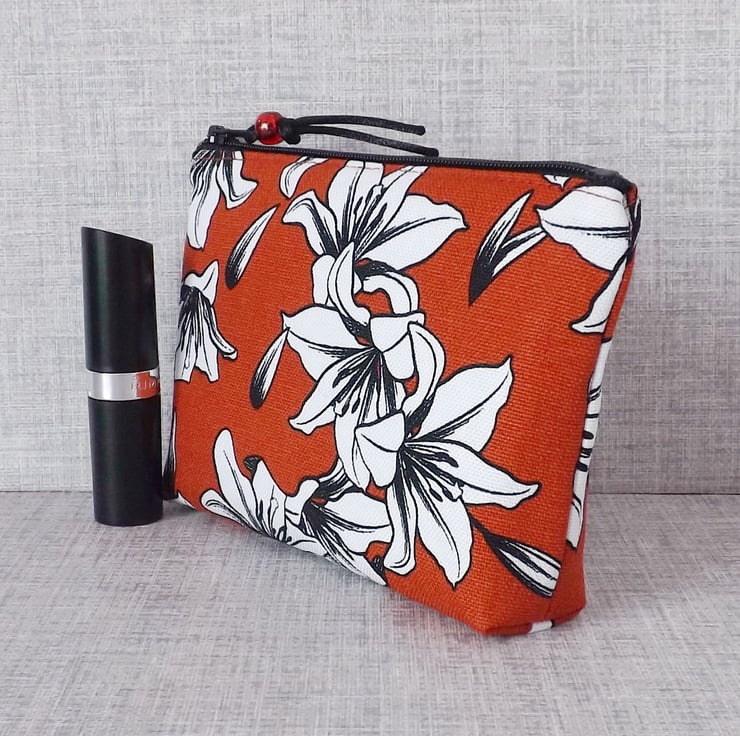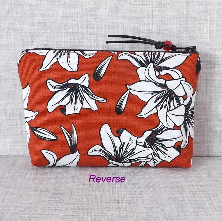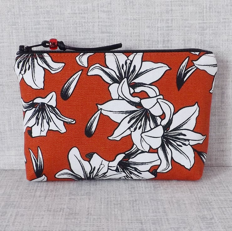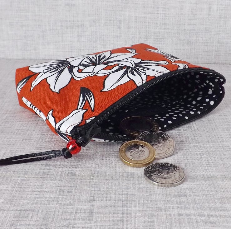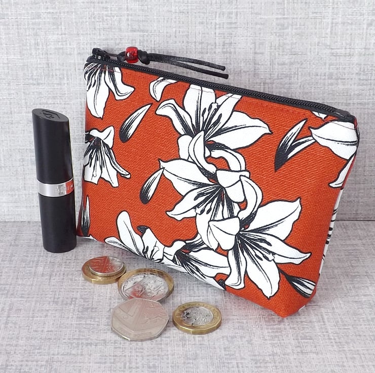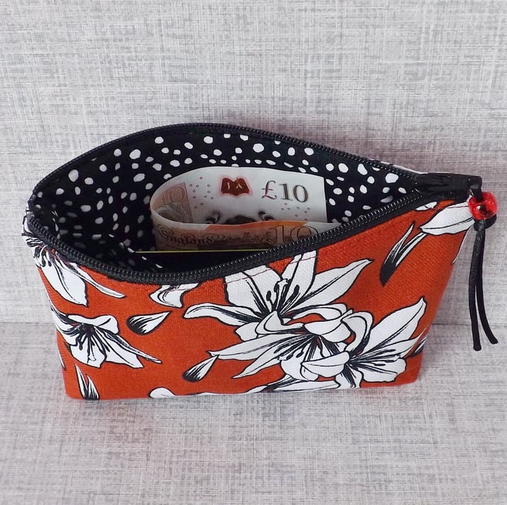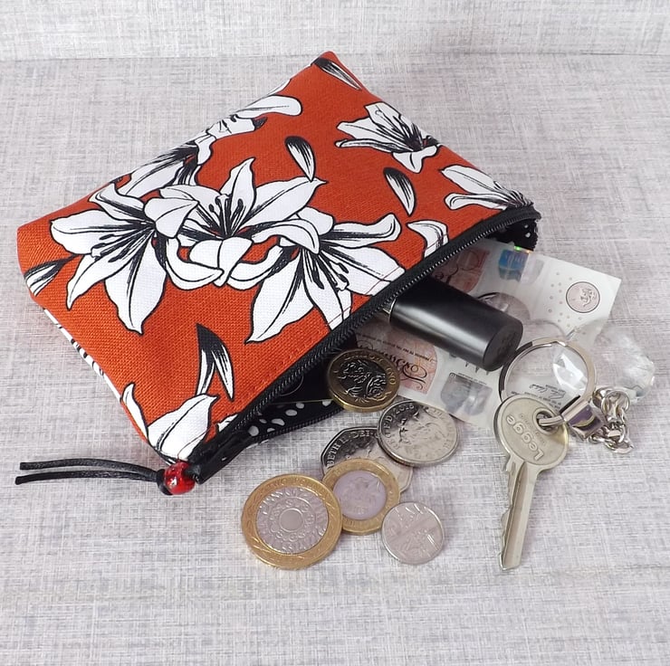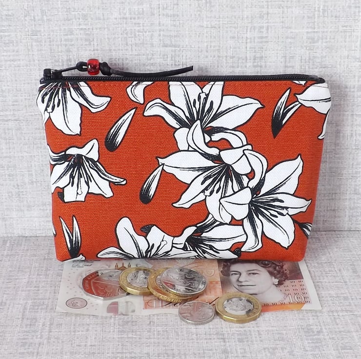 A large size coin purse made from cotton canvas fabric with white lilies, outlined in black, and on a terracotta background. The lining is a black cotton fabric with white spots on. There is a pocket on the inside for a credit/debit/store card or some notes.