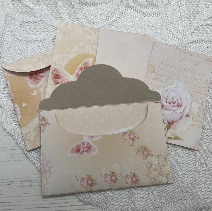 A pretty and dainty rose paper design, made into a main envelope with hook and loop closure. Rose gold paper fastener with a pink flower and rose gold charm. Inside another envelope with journaling cards and an envelope. Mini folder with pockets and papers sealed with an altered butterfly paperclip in rose gold.