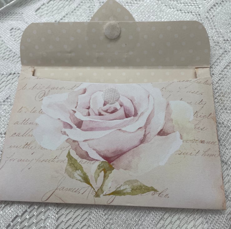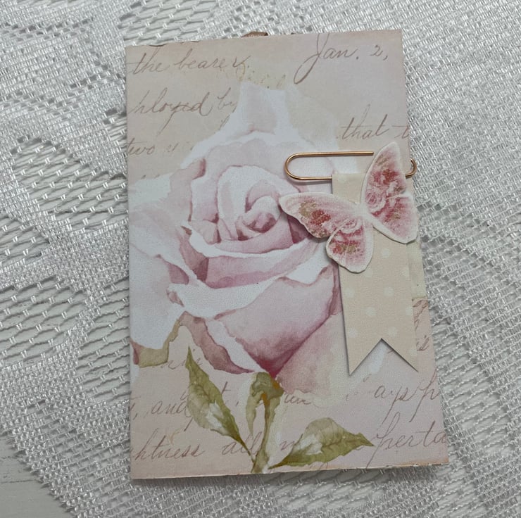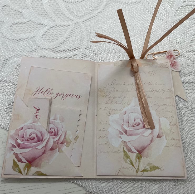 A pretty and dainty rose paper design, made into a main envelope with hook and loop closure. Rose gold paper fastener with a pink flower and rose gold charm. Inside another envelope with journaling cards and an envelope. Mini folder with pockets and papers sealed with an altered butterfly paperclip in rose gold.