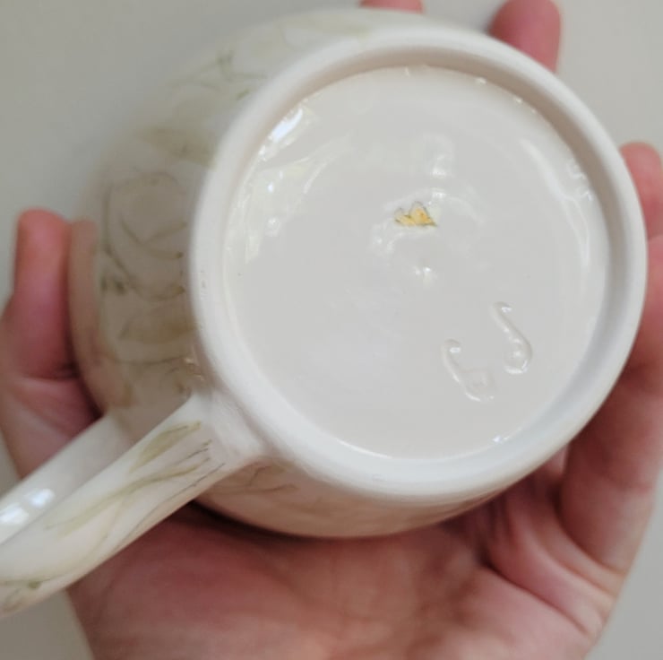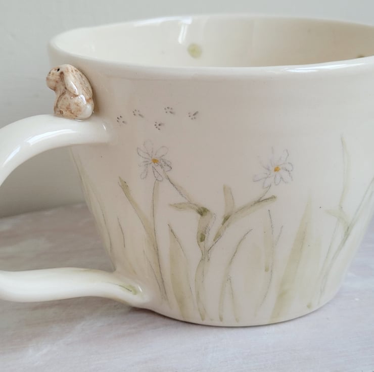 A hand made ceramic mug made on my wheel. I added a tiny beige lop earred bunny and footprints on the cup and handle. I bisque fired the mug, hand painted it with underglaze colours and then it was clear glazed and fired to earthenware temperatures in my kiln.