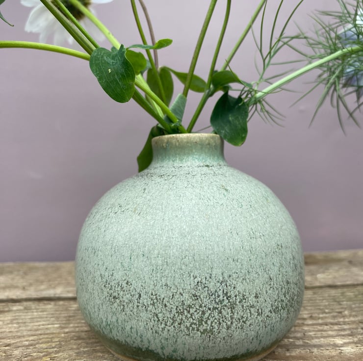 Made using St Thomas stoneware clay, glazed with "Solstice" from my own glaze range and fired to 1250c. This vessel is perfect for loose stems.