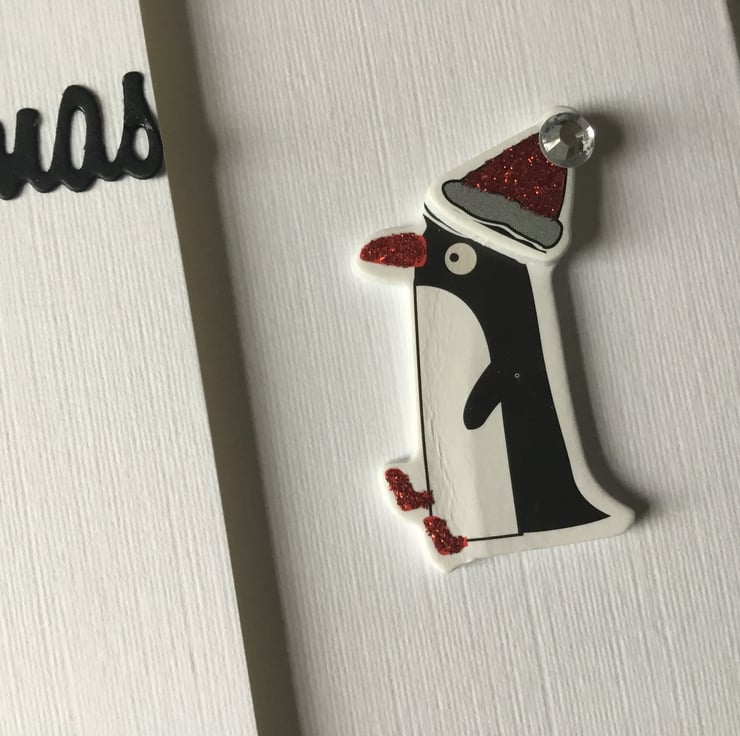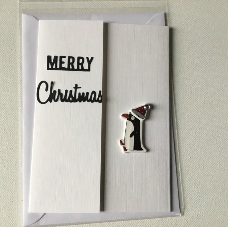 A cute little penguin sits on this handmade Christmas card alongside a Merry Christmas greeting.