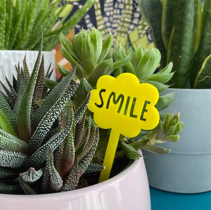 I designed and made this Smile house plant decoration either to keep for yourself if you’re a crazy plant lady, indoor plant lover, love a motivational quote, or you want a gift for mum, unique gifts for women, or the indoor gardener in your life. Made of food safe acrylic, this plant marker is going to be durable and long-lasting, so you can be sure it will bring happiness for years to come!