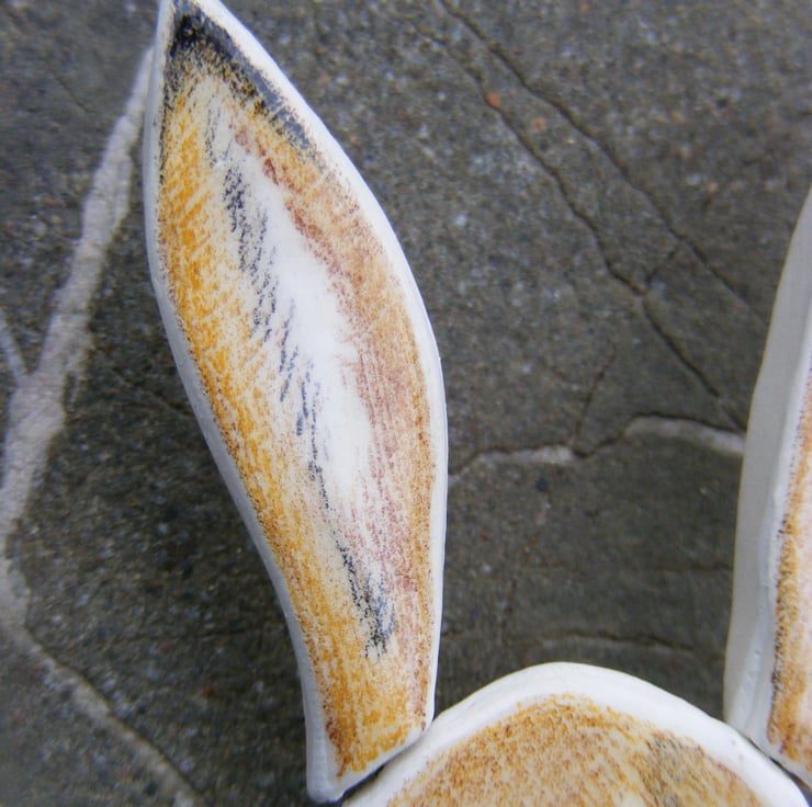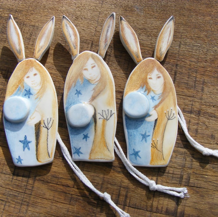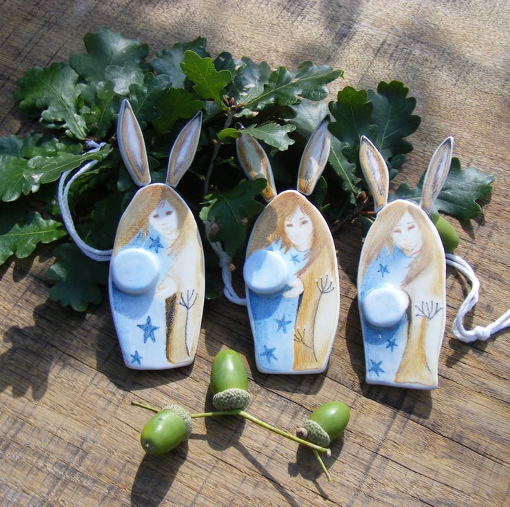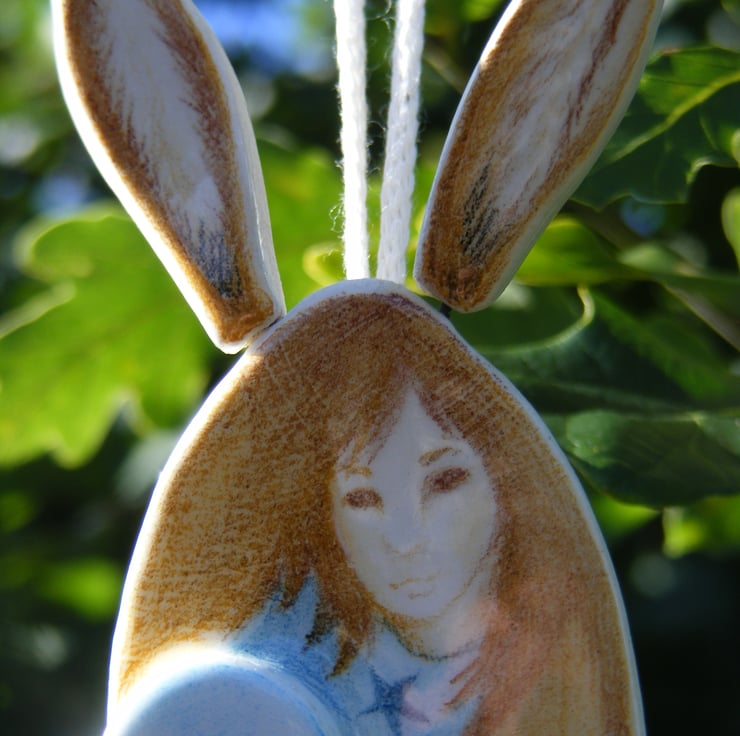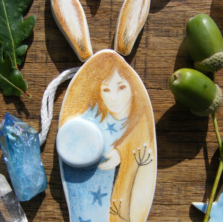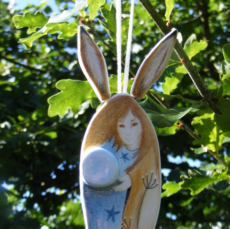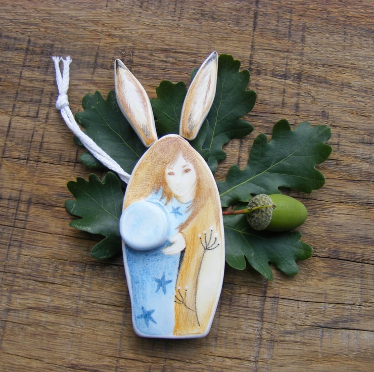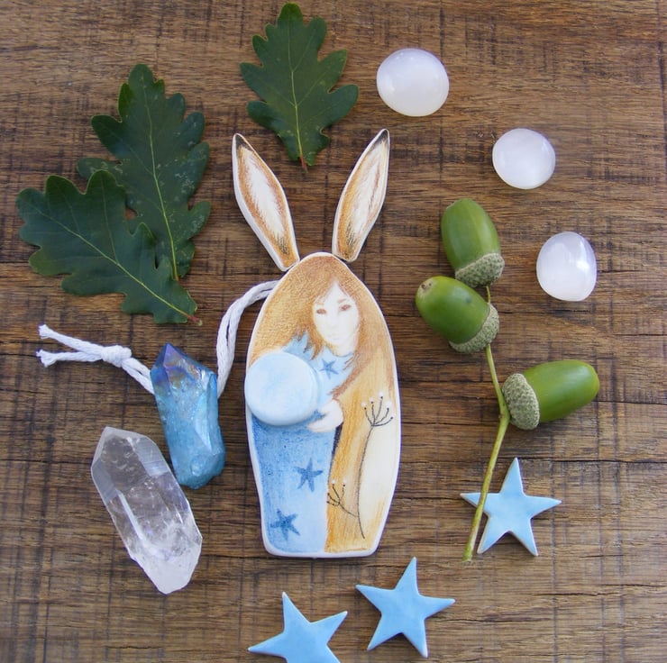 Hare Girl ceramic glazed figurine nurtured and handcrafted in my studio. This beautiful delicate little Hare Girl has attached Hare ears (they do not move or come away from the figure). Dressed in a gown half earthy and half stars and sky she holds a ceramic raised Full Moon, her very own moon to gaze at! Attached on the back is a hook with macramé cream cord for hanging or remove the cord and use as a little figure to rest against an item or wall in your home. She stands approx 13.5 cm high by 5.5cm at her widest point. Hare girl is for display purposes only and is not a toy nor frost proof. She is accompanied with a hand written poem by myself to portray her journey and the listing is for one Hare Girl only, items in photographs are for prop purposes only.
