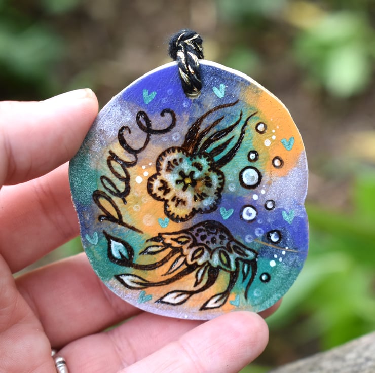 A hand burned pyrography wood slice decoration, with a jelly fish design and the word peace.