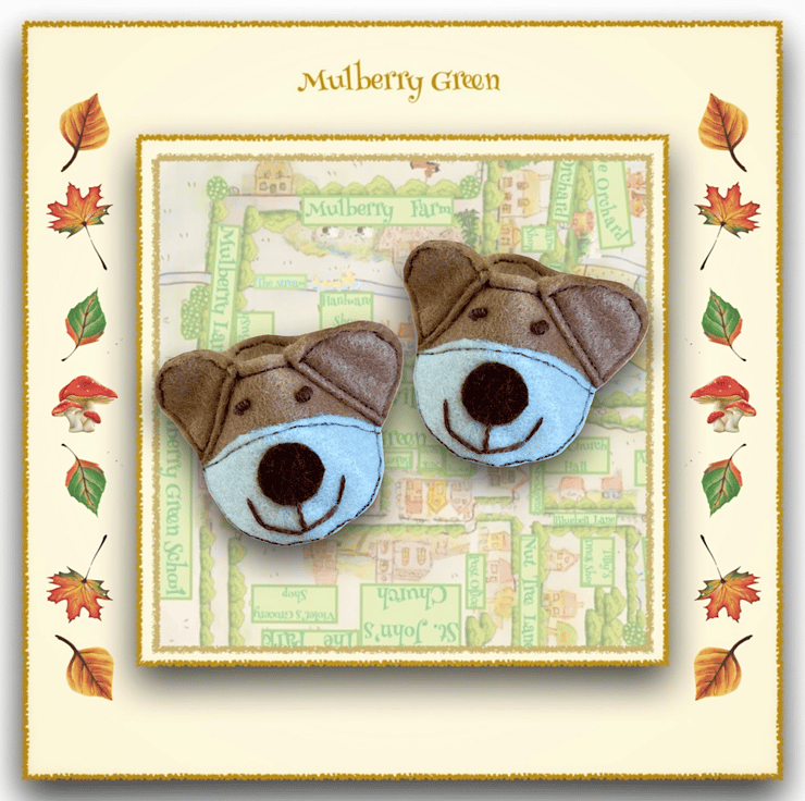 A cute little pair of puppy dog slippers to fit the Mulberry Green characters. The slippers are made from double stitched felt with a puppy face and ears and just slip onto the doll’s feet.