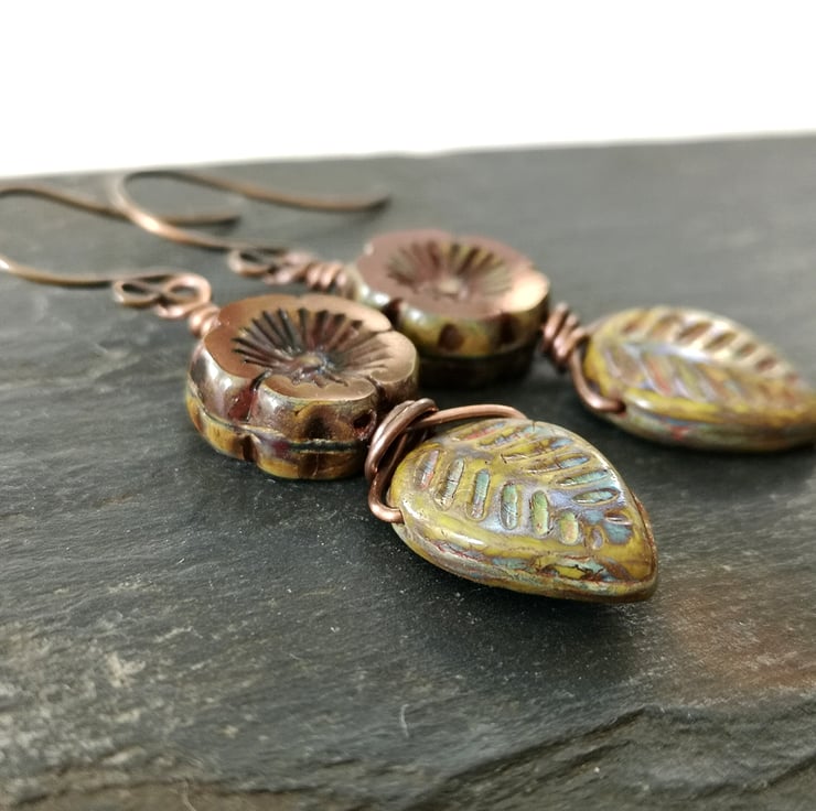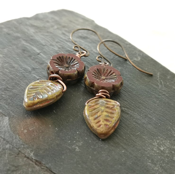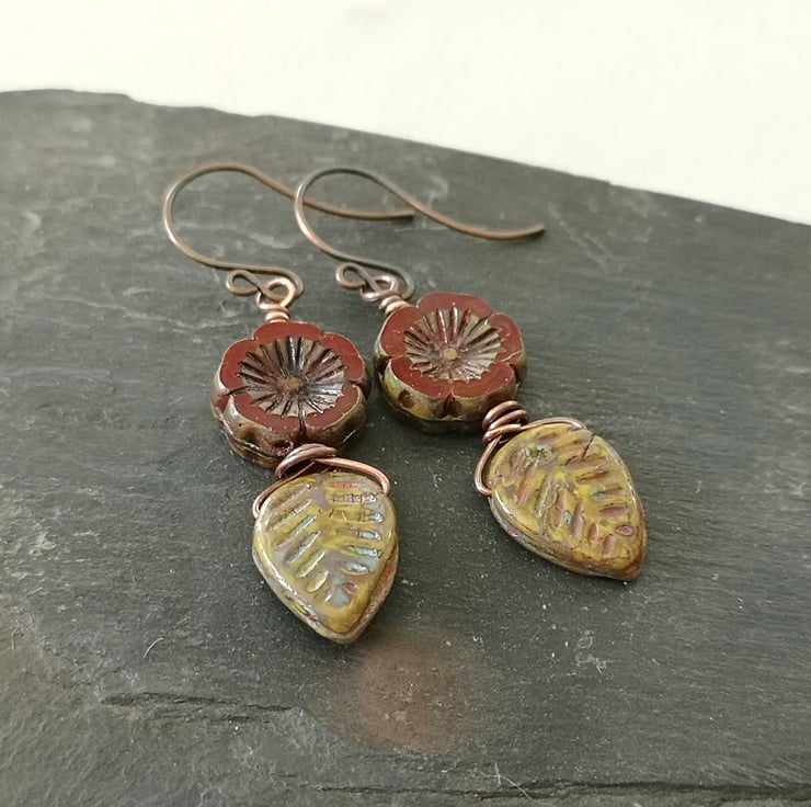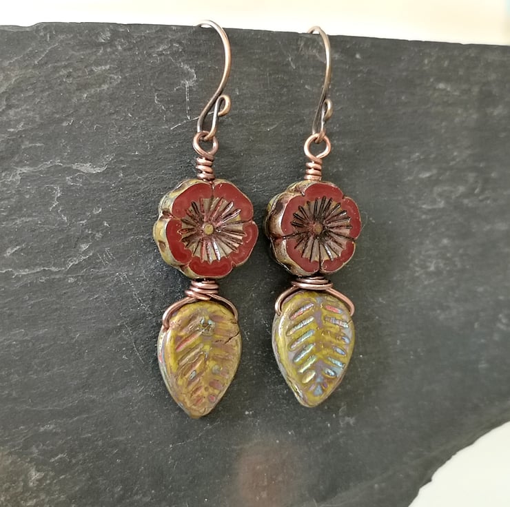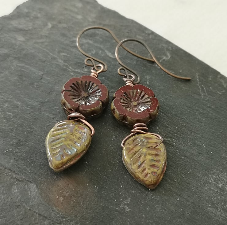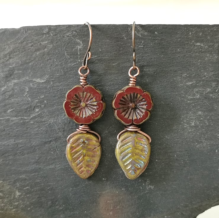 These earrings have been made with Czech glass flower and leaf beads. A rich burgundy red for the flowers and a mottled green for the leaves. They're complimented by copper wire work and ear wires.