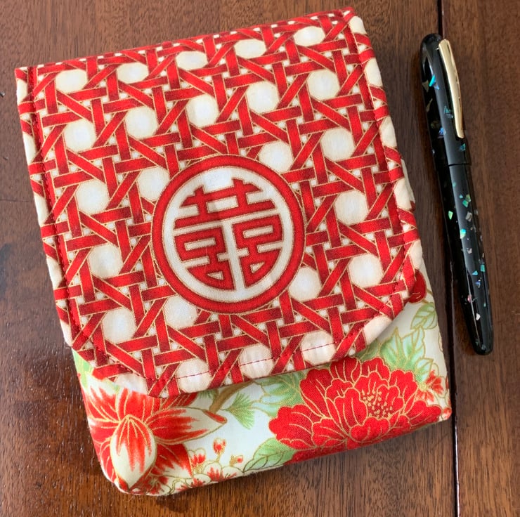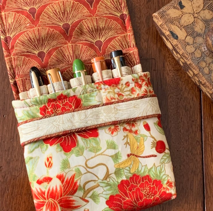 The outer, padded case contains a removable stiffened insert with fabric loops to hold, separate and protect the pens. All visible fabrics are 100% cotton. Three types of interlining provide cushioning, support and stability. The pen slots are 10 cm long so give excellent protection and will house all but the chunkiest of pens, while the tuck-under outer flap adjusts to accommodate extra-long pens. There is space behind the insert in which to tuck a note of pens and inks, plus a small slim notebook. Only a very limited number of each case will be made.