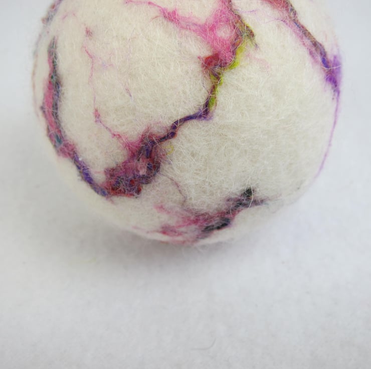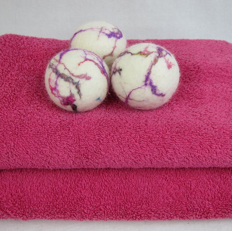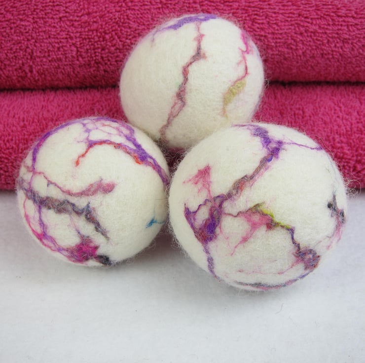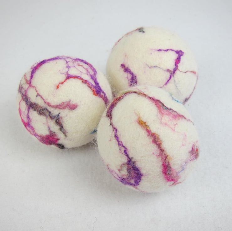 A set of three felted drier balls which have been made from woollen fibres with a few multicoloured silk strands added to the surface as decoration. These balls are firmly felted using 100% woollen fibres (not yarn) and will not unravel.