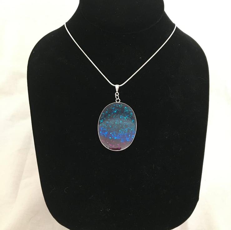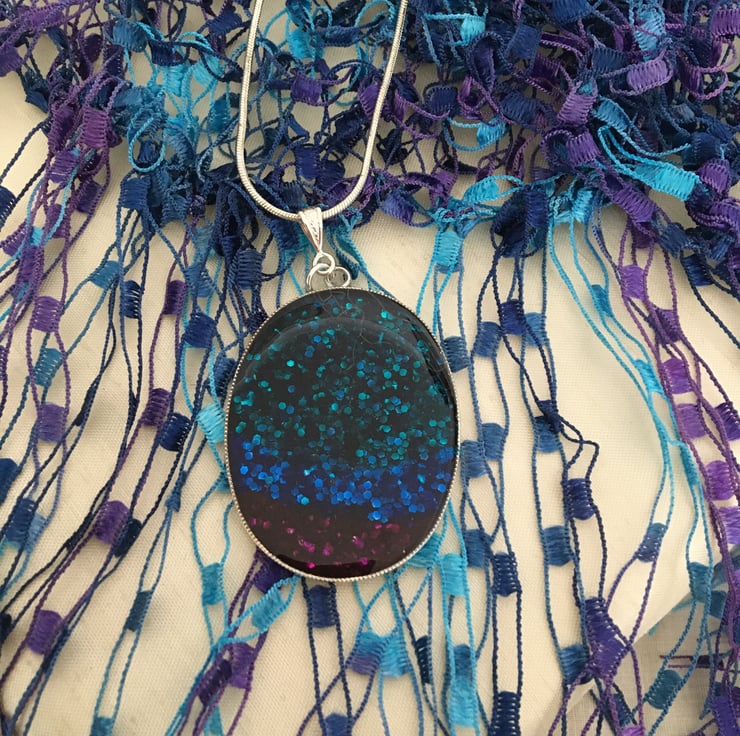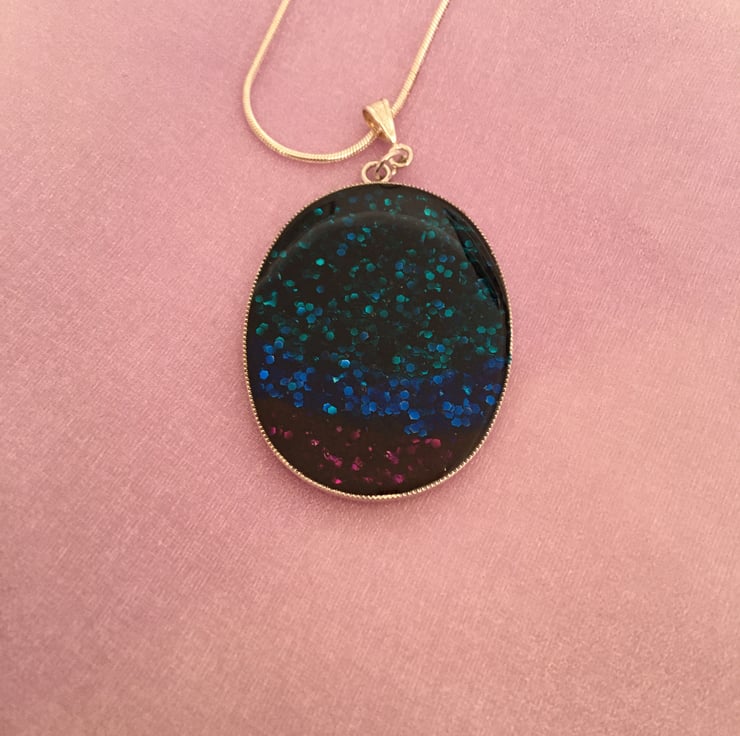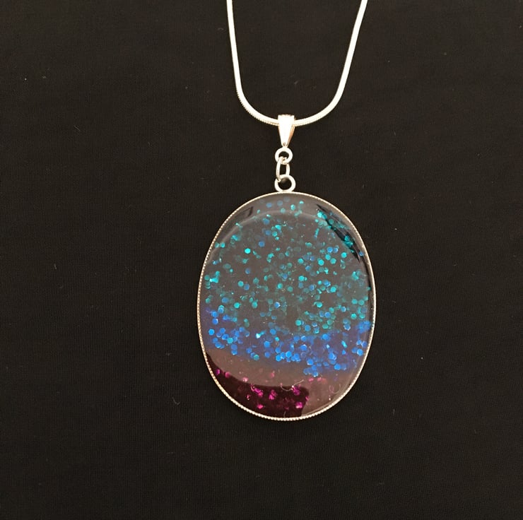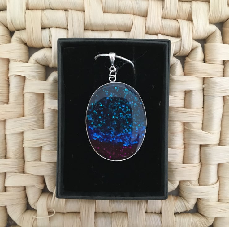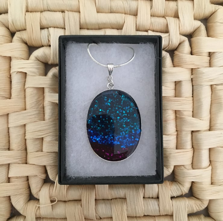 The handmade centrepiece is created using a tri-colour base with a 2 part resin mix overlay. Please note that as this is a one-off hand finished pendant it can have tiny imperfections, this is a normal part of a handmade design.
