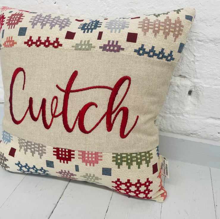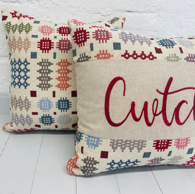 Cwtch 16” Panel Cushion- in our popular welsh blanket style fabric. The word cwtch is embroidered in a choice or Red,Teal, Green or Grey on a central panel with the welsh blanket style fabric on the top bottom and reverse.