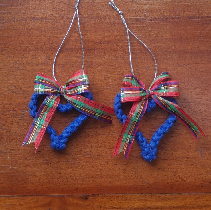 Decorate your tree with these boho macrame decorations in traditional blue colour accented with tartan bow.