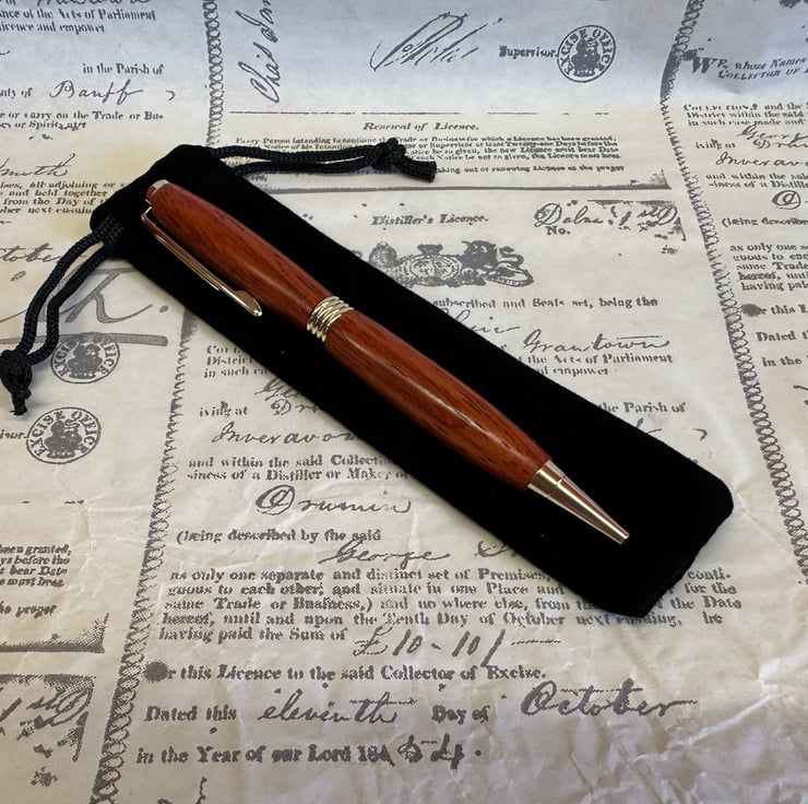 This pen comes in a velvet sleeve. A black Cross style refill is included, but could be changed to blue or red if you so desire, and takes easily replaceable standard Cross style refills.