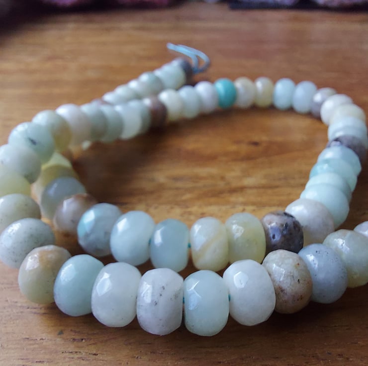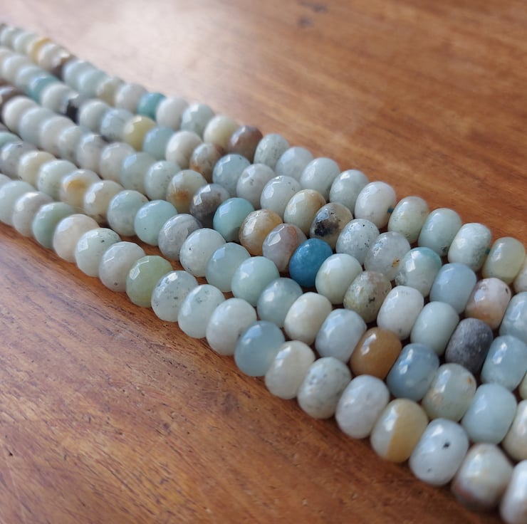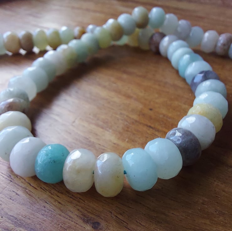Beautiful mixed colour Amazonite strands of faceted rondelles. 8 x 5mm, 15" strand. Strand colours vary.