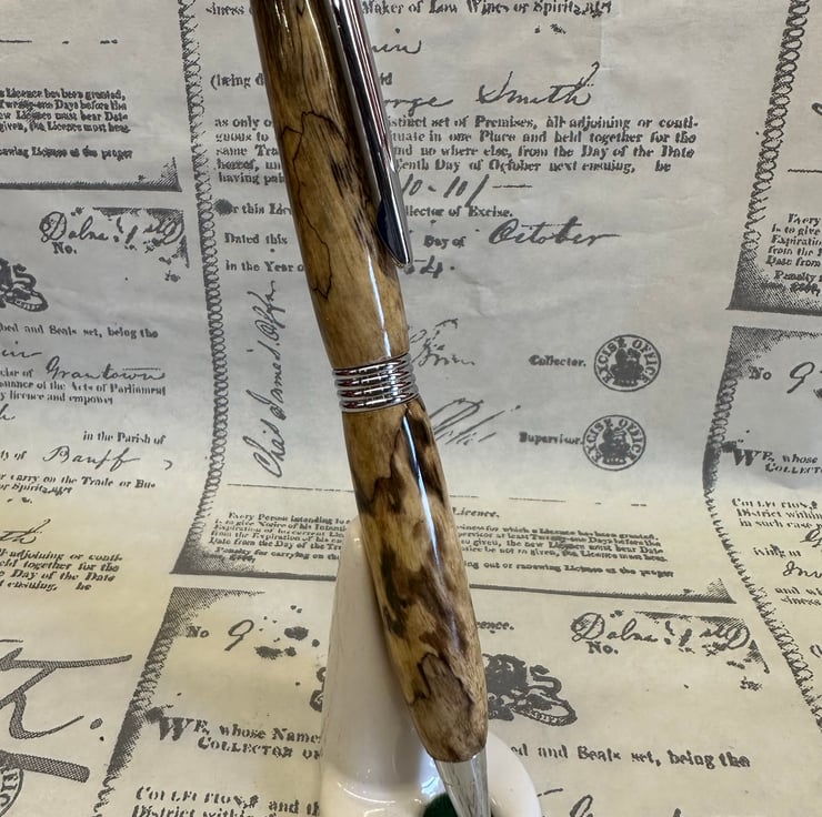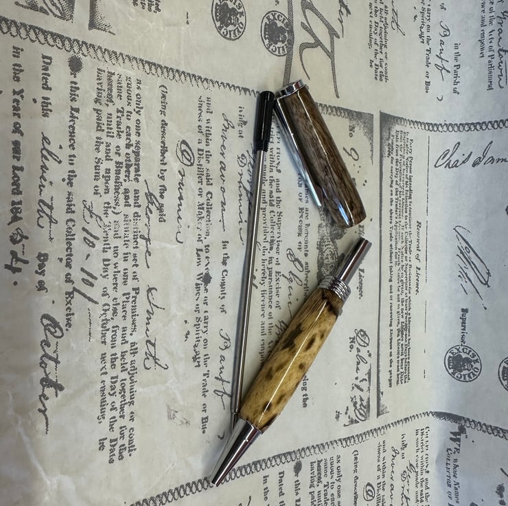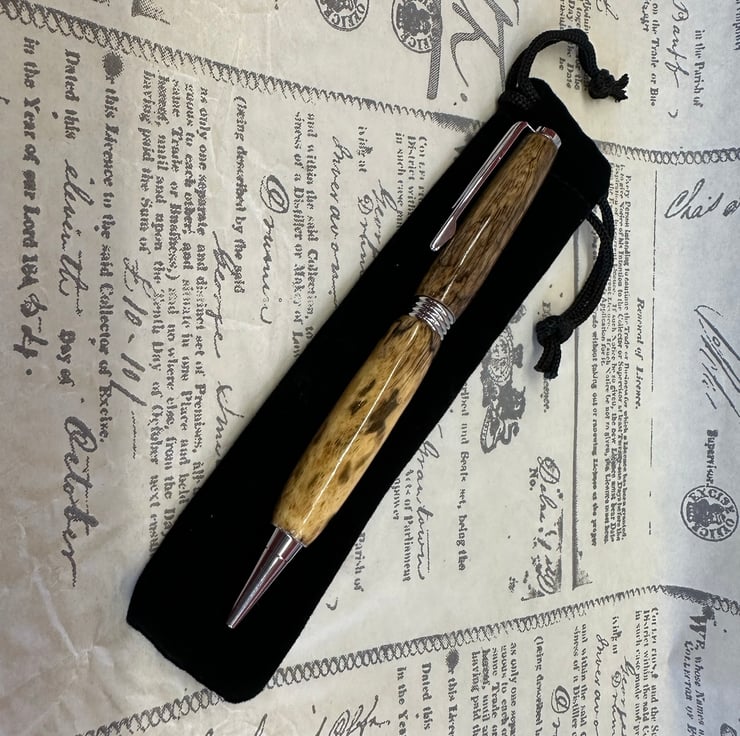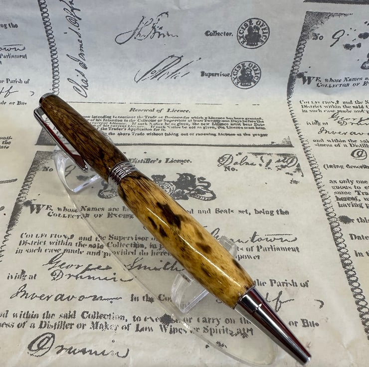 This is a Chrome Streamline Twist Pen with a Spalted Tamarind body finished in a lacquer coating; a stylish and easy to use pen due to its light weight and grip size.