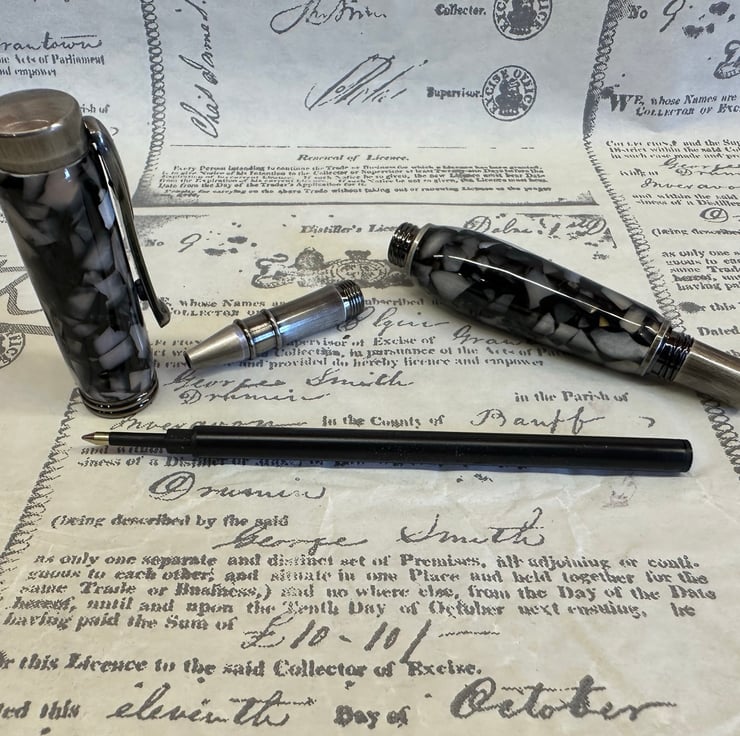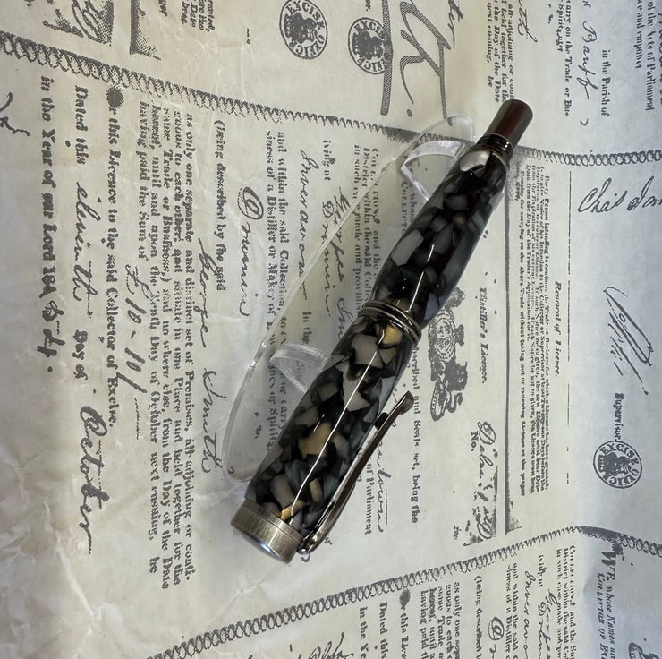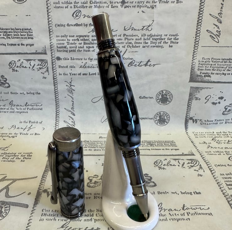 This is an Antique Pewter finished Retro Rollerball pen with an amazing diorite acrylic body finished in a highly polished coating; features al pocket clip and a comfort grip nib section.