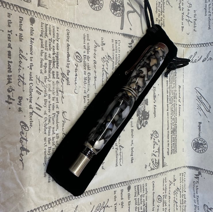 This pen comes in a velvet draw string sleeve. A black premium fine tip refill is included and takes easily replaceable standard rollerball refills. To replace the ink, unscrew the metal section as shown in the pictures, remove the old ink refill ensuring the spring is retained. Place the spring into the pen body, then place the new ink refill. Carefully screw in the metal section ensuring the threads align, only a very light pressure is required to tighten fully.