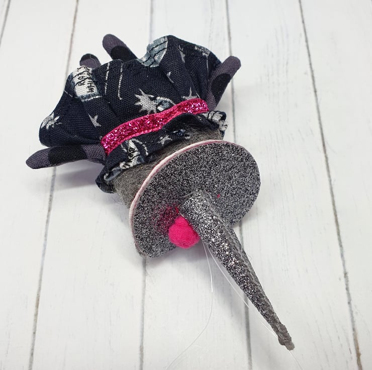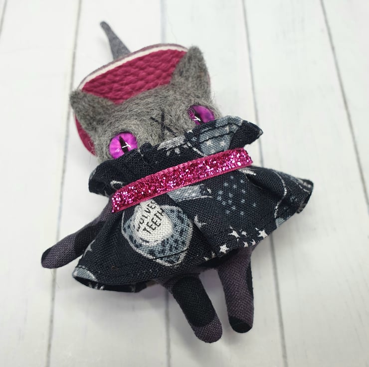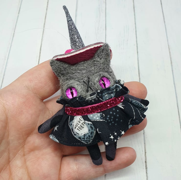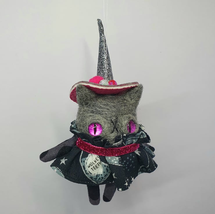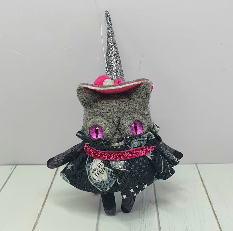 Needlefelted charcoal cat witch with glass eyes and hand sewn details. The dress is sewn into place with glitter ribbon around the neck. The hat is hand sewn with sparkly beads and a pom pom. The hat is made from chunky glitter fabric and sewn into place. Kitty comes with transparent loop hanger and measures roughly 12cm tall. This is for decorative purposes only and not a toy.