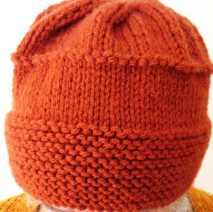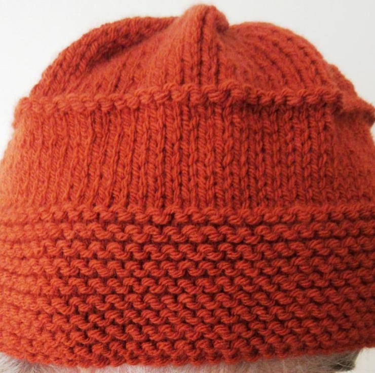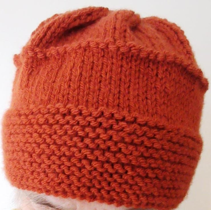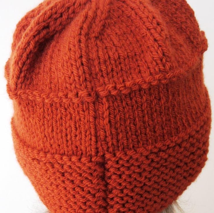 A hand-knitted beanie-style woman's hat in chunky acrylic yarn in a rust/copper colour. The hat has a garter stitch welt and a back seam.