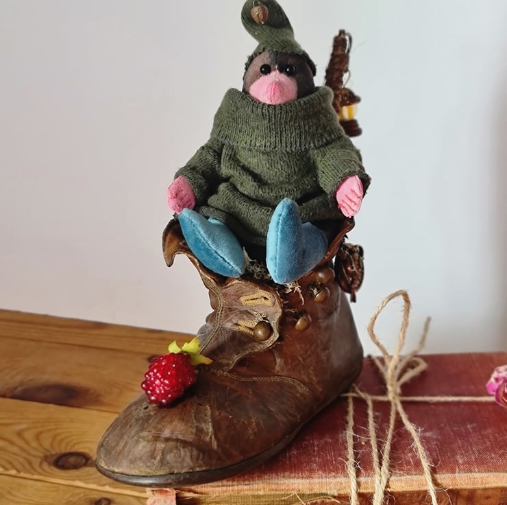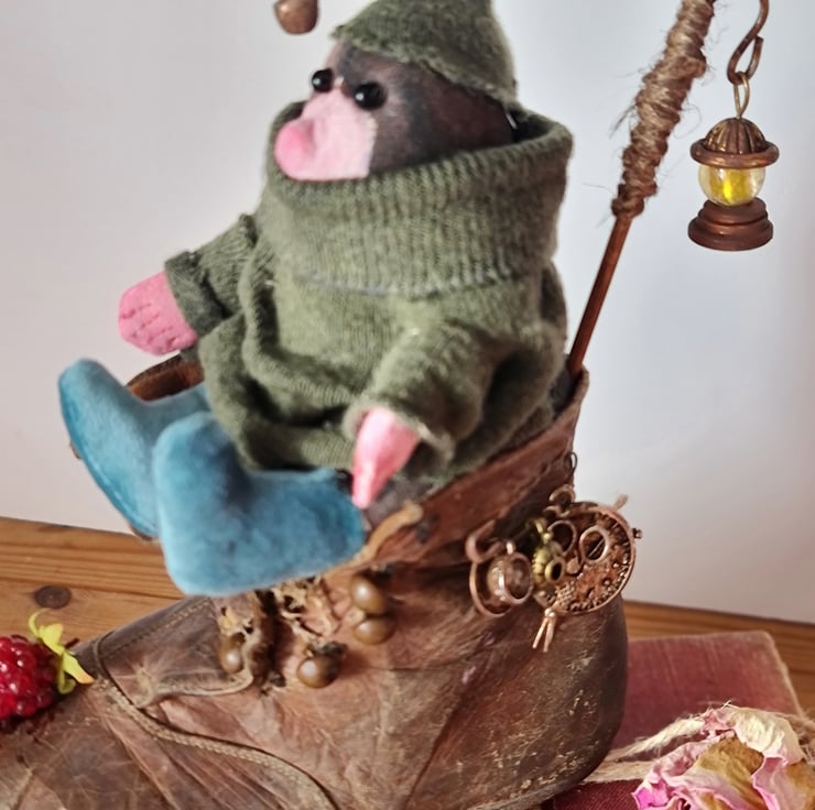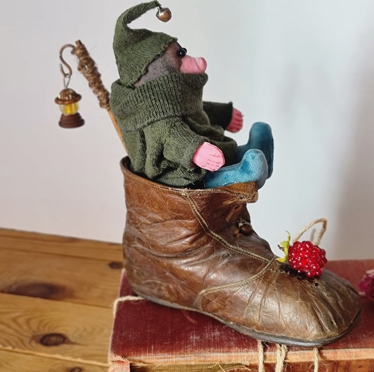 This Piece is set in an 1897 to 1910 antique childs leather boot. Mole is hand and machine stiched and hand painted in unbleached cotton. Mole is wearing a forest green jumper and hat. His boots are made of powder blue velvet. On the boot is a rusty pin with all of moles necessaries , cup and saucer, kettle, scissors and clock. A raspberry is perched on the front and a little handmade oil lamp on a stick dances at the back. This piece is made to look aged and worn so i have left much of the leather as it is.