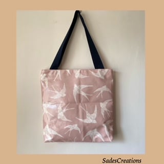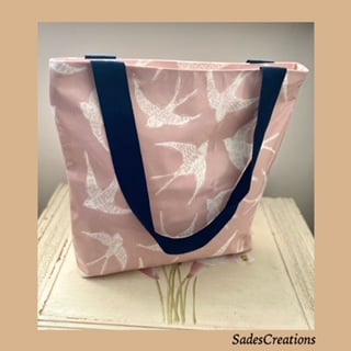 This beautiful tote bag in Fly Away Sorbet Pink design is waterproof and fully lined with 100% cotton. It has a box base to retain shape and a recessed zip to seal the tote shut. The handles are made from navy cotton herringbone tape webbing with a handle drop of 11 inches with a navy zip.
